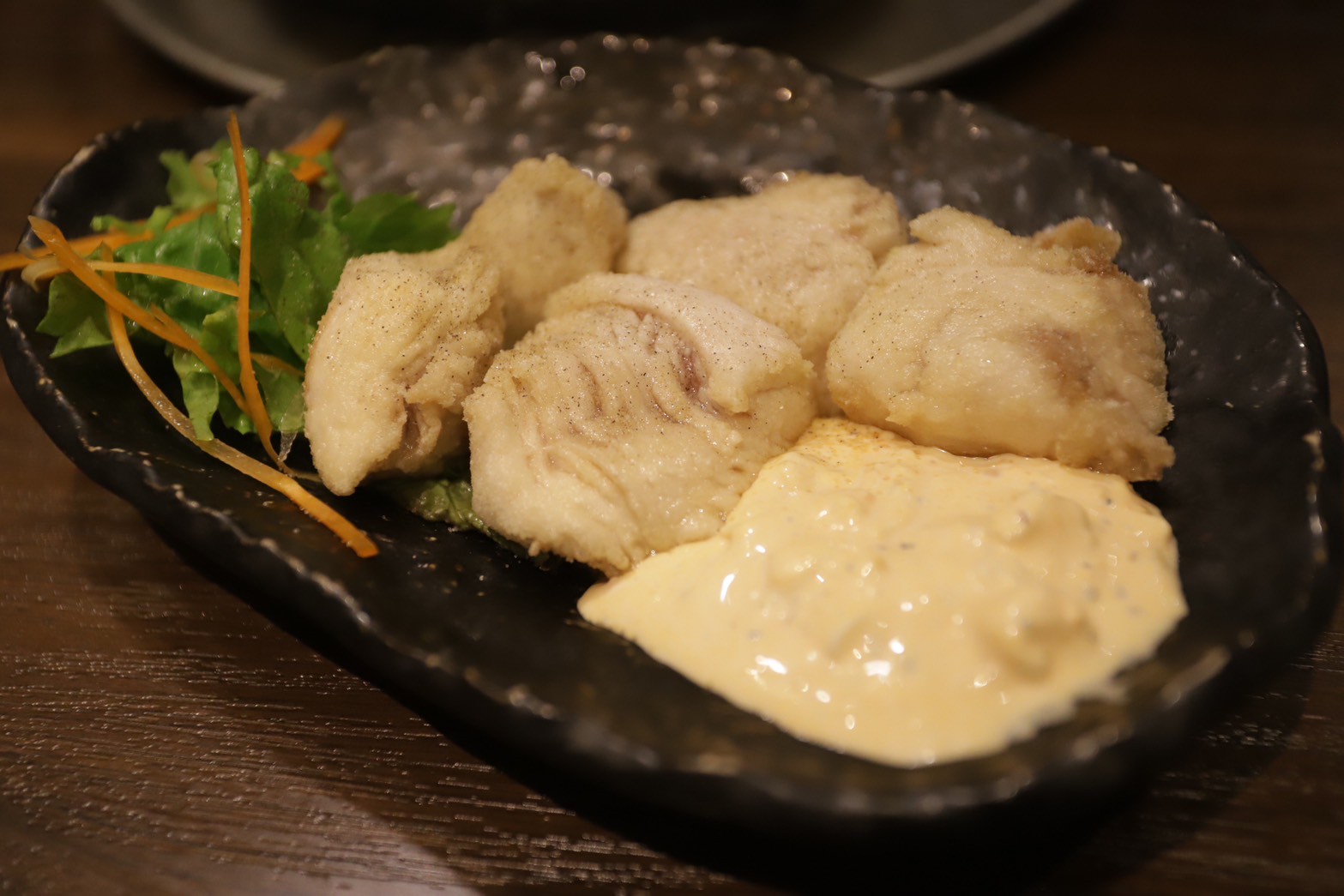 朝びき鶏のレア唐揚げ(528円):ふわふわで柔らかいササミをさっと揚げたもの。たっぷり添えられたタルタルソースとの相性も抜群です。