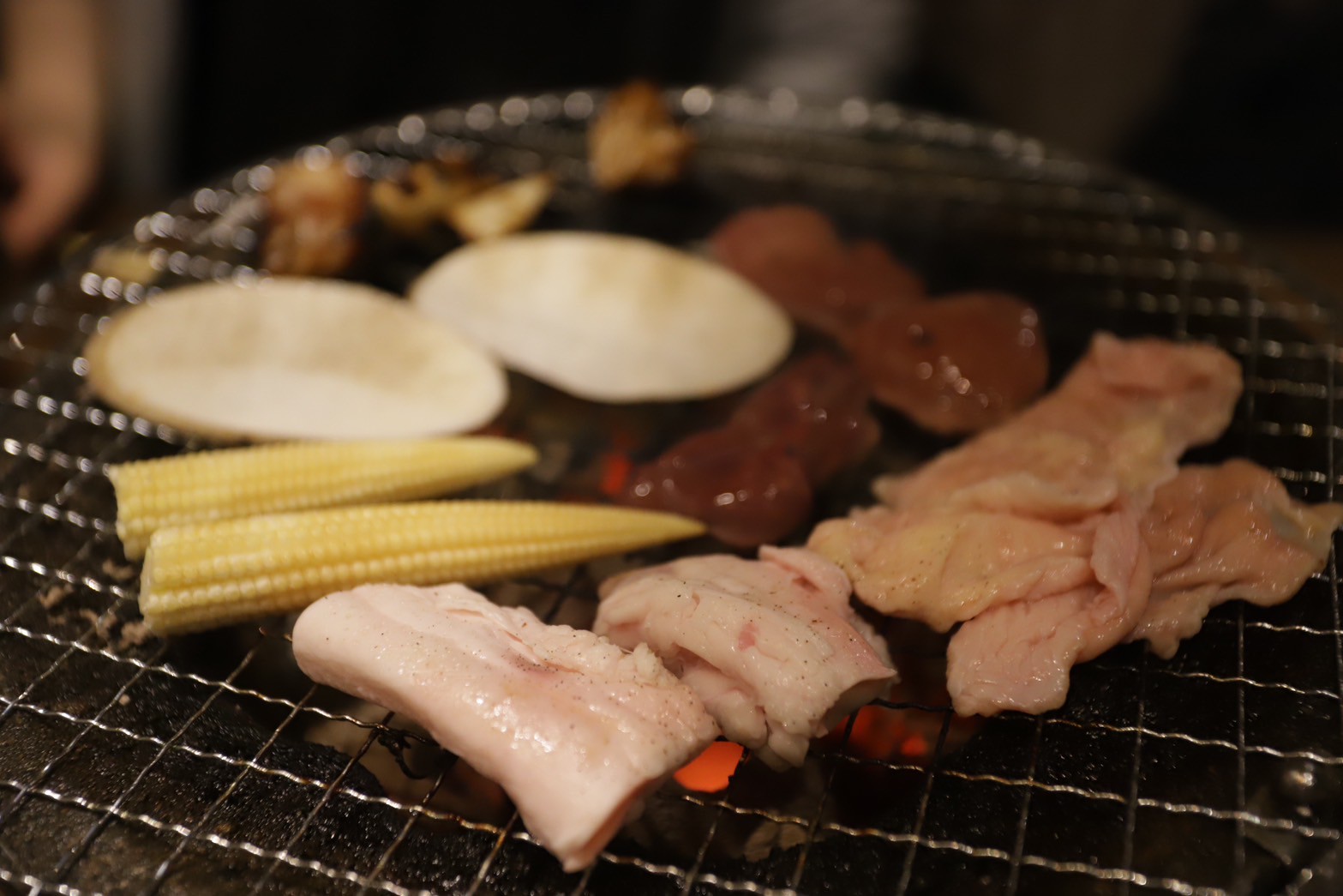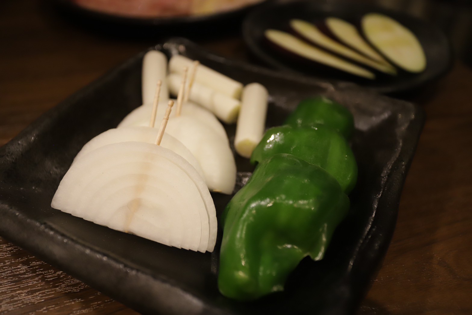 鳥肉だけでなく、七輪で一緒に焼く野菜も欠かせません。鳥の脂が染み込んだ野菜は、また格別の美味しさです。