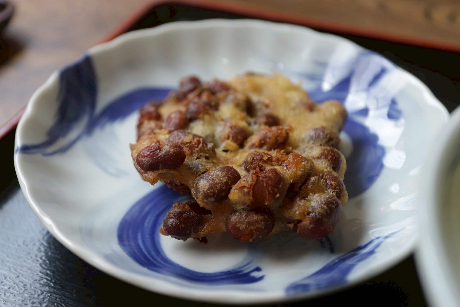 天ぷらの誘惑に負けて選んだのは、関西では珍しい「金時豆天(150円)」。