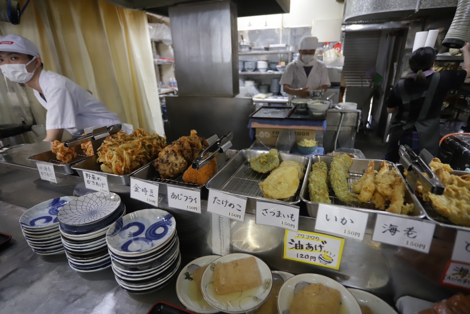 セルフカウンターに並び、注文。目の前にはずらりと並んだ天ぷらがあり、その誘惑につい負けてしまいそうになります。これがうどん店の「マーケティング」だと分かっていても、その効果は絶大です。