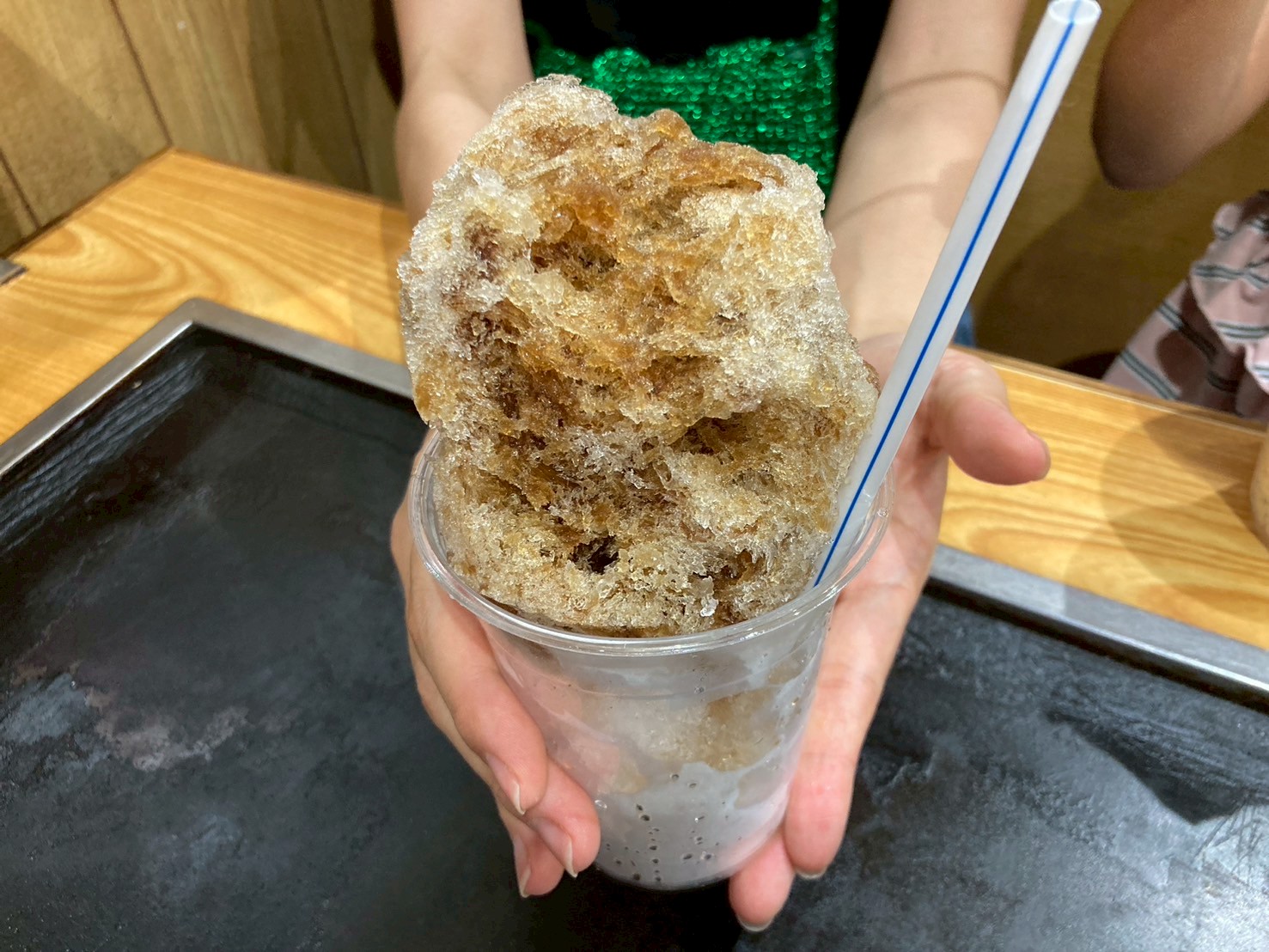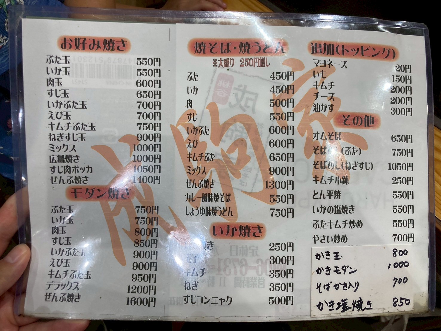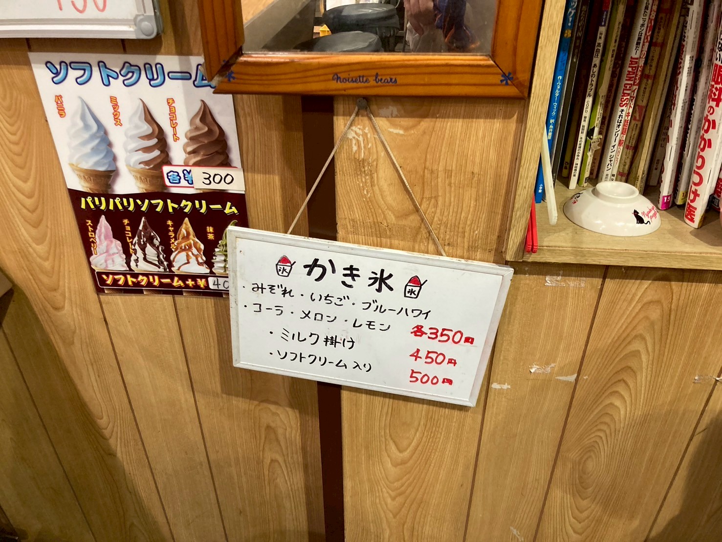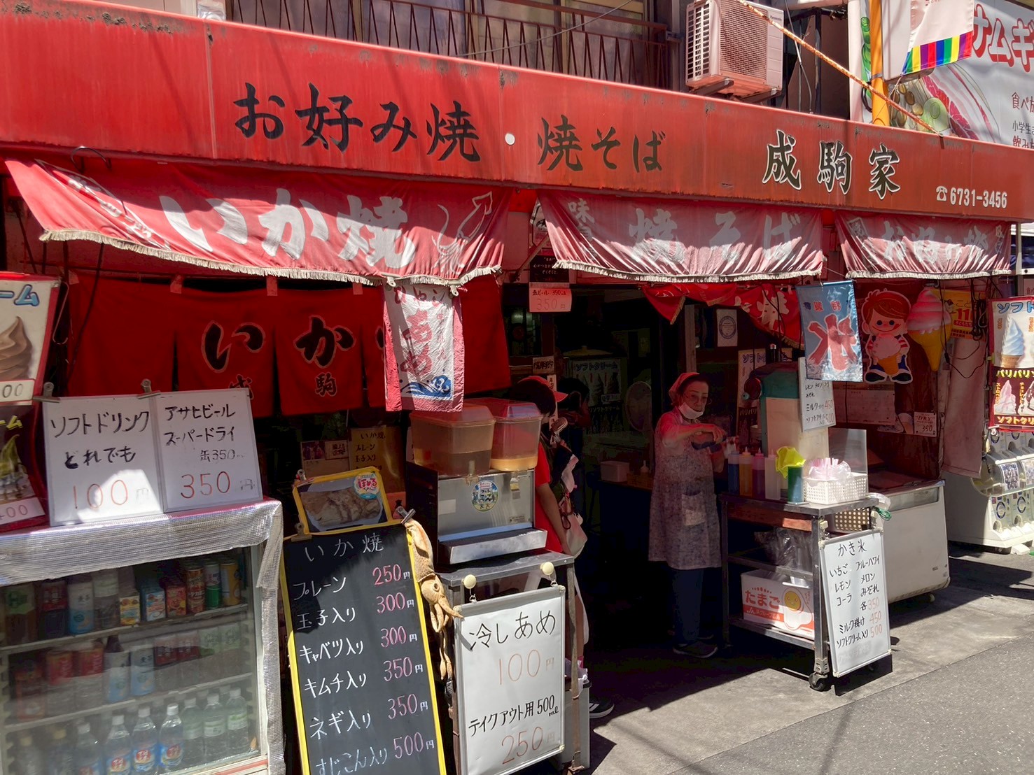 店内はエアコンが効いており、暑い夏の休憩に最適です。ここでは、お好み焼きだけでなく、昔ながらの「かき氷」も楽しめます。定番の味を気軽に味わえるので、お子様連れでも安心して立ち寄れます。