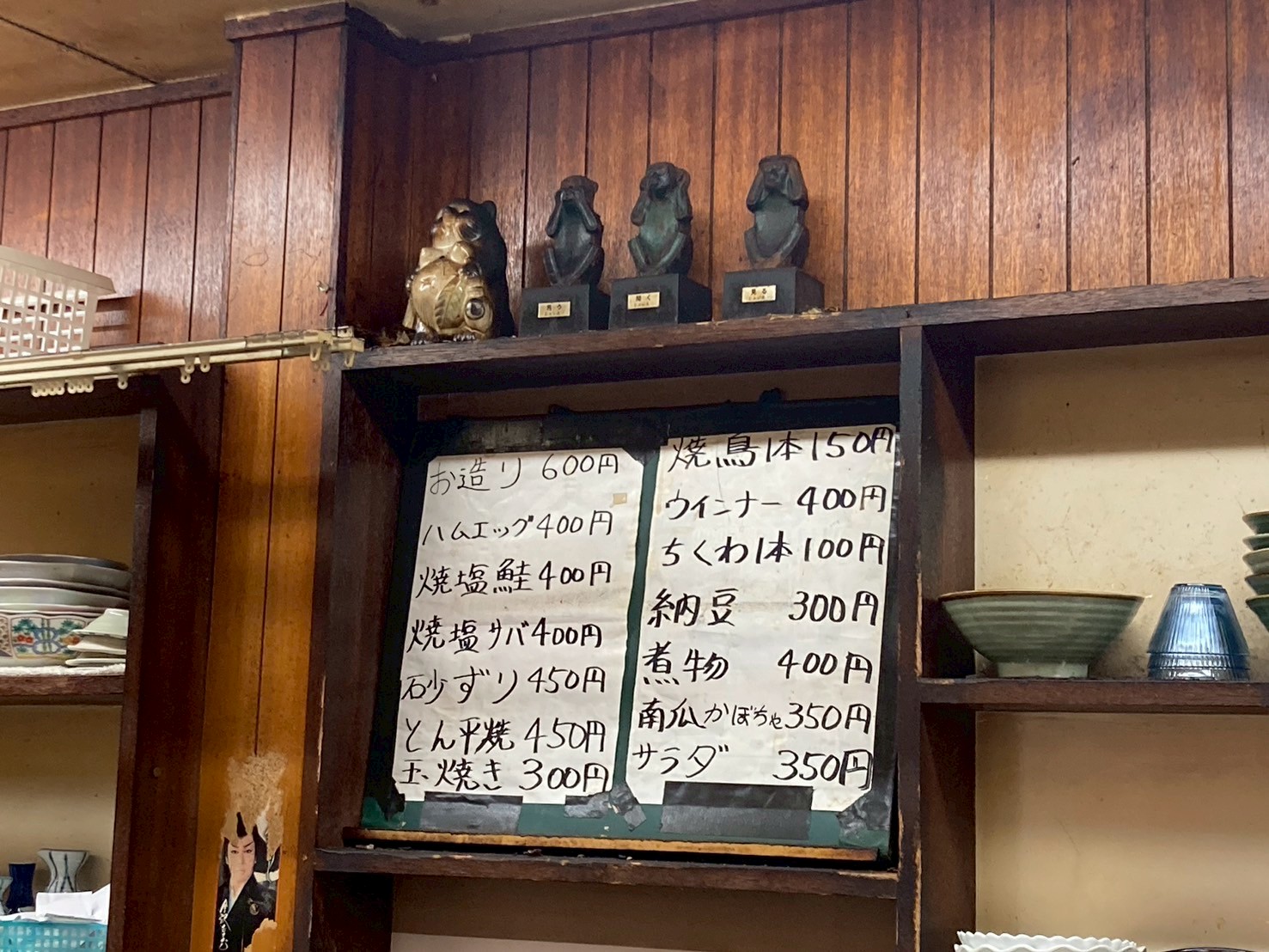 ちょっとした一品も置いてあり、常連さんがパックのお刺身をつまんで飲んでる。