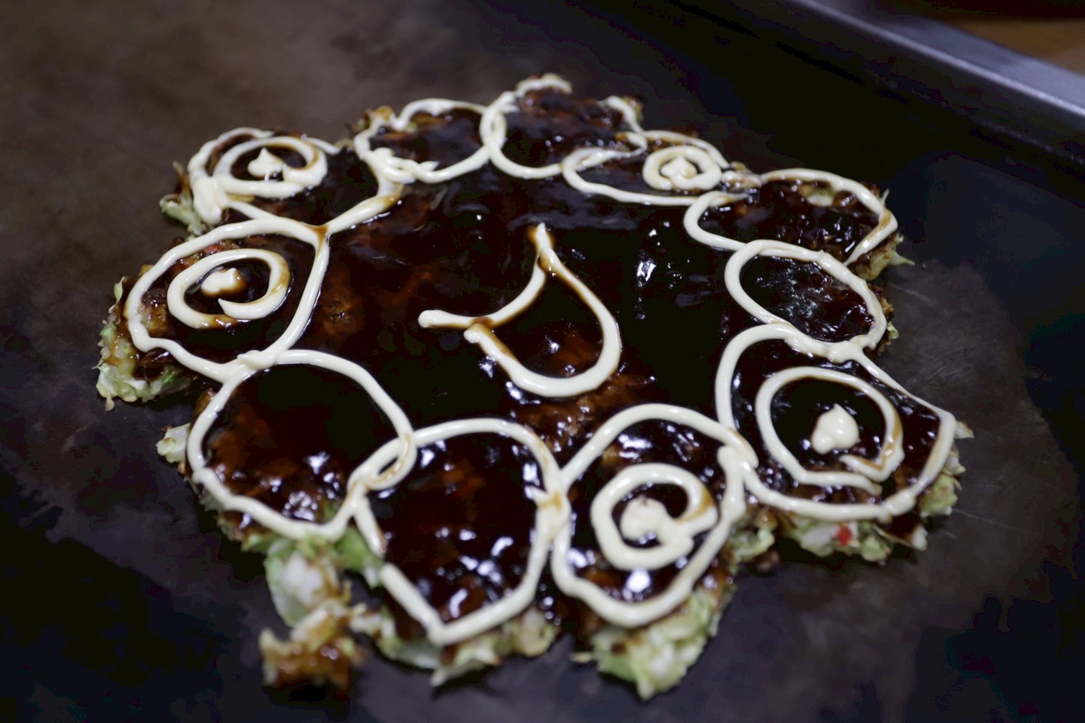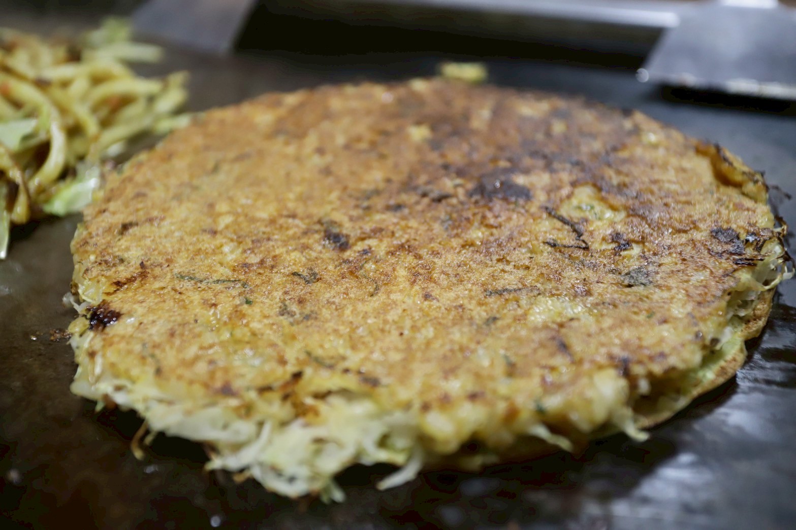 生地の上に極細のせん切りキャベツと焼き飯を乗せて焼き上げる。
