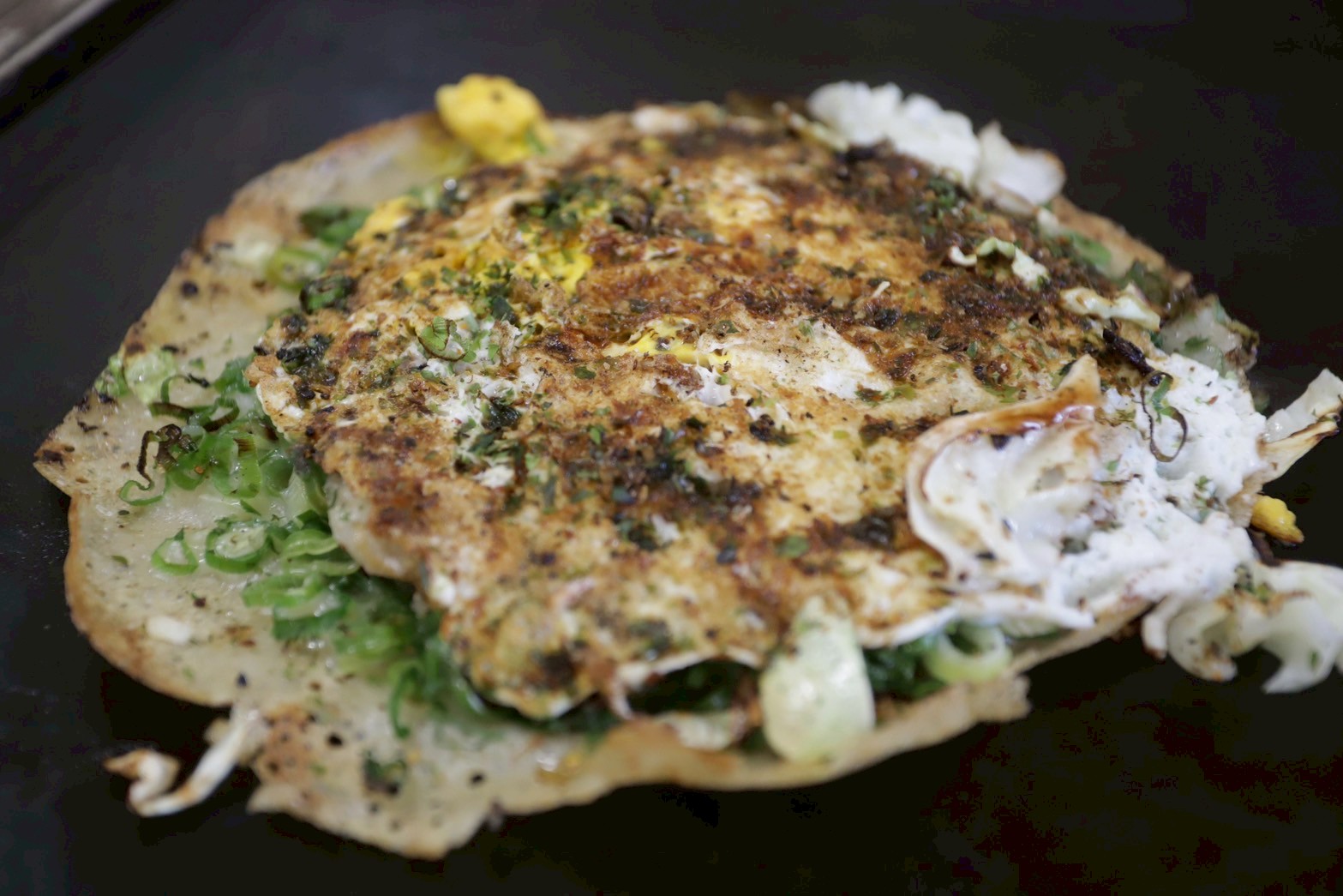 それが「まんぼ焼き」。薄生地の上にそばと具材を乗っけて、生地をかけ成形しながら焼くのが特徴です。