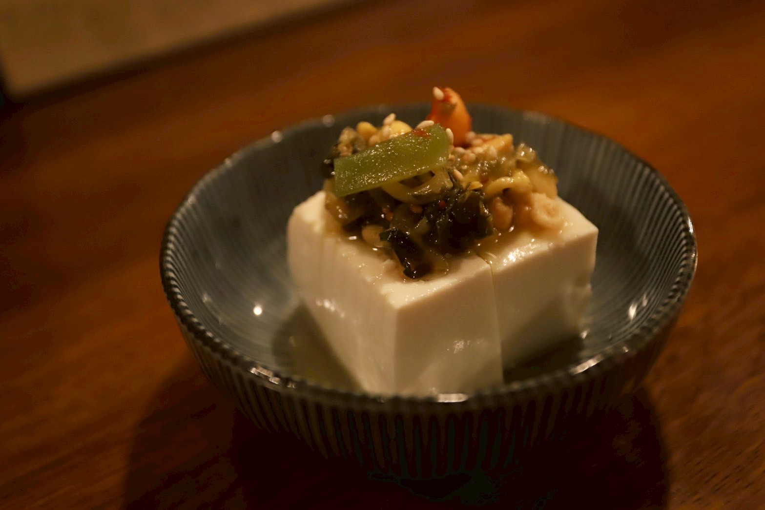 カンパイしてお通しのナムル豆腐をつまむ。