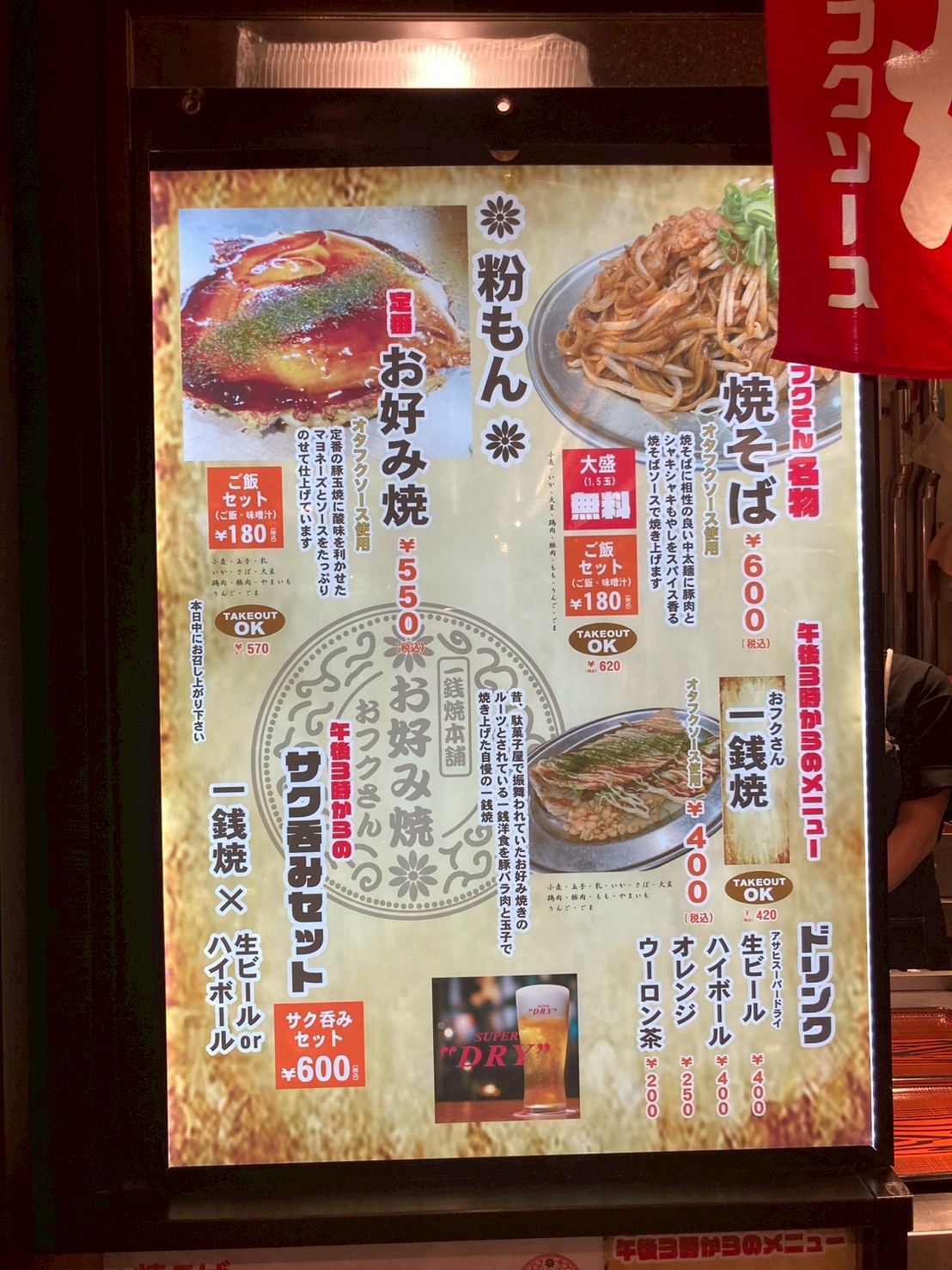 前回きた時はお好み焼きを頼みましたが、看板をよく見ると「一銭焼き本舗」と書いてある。