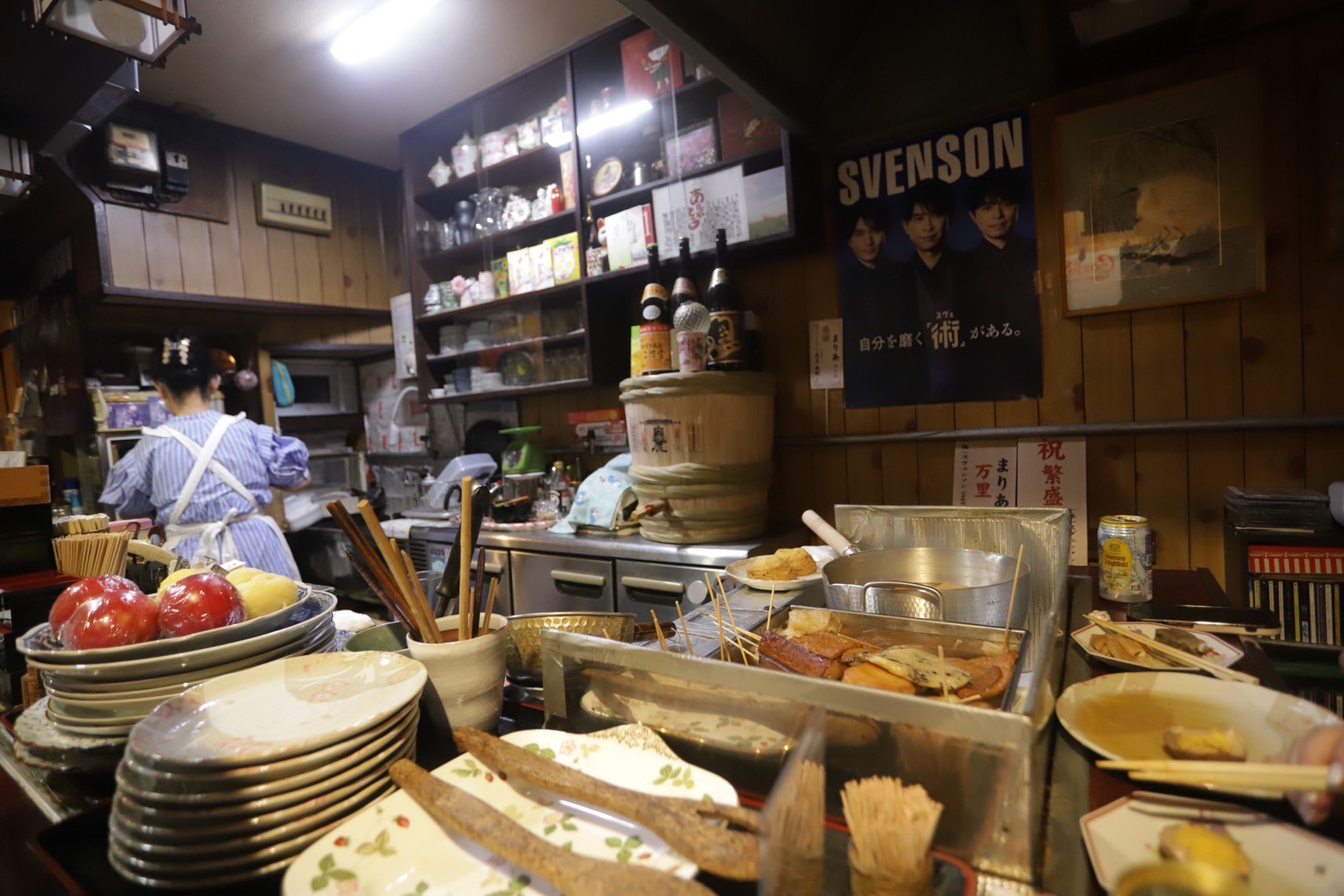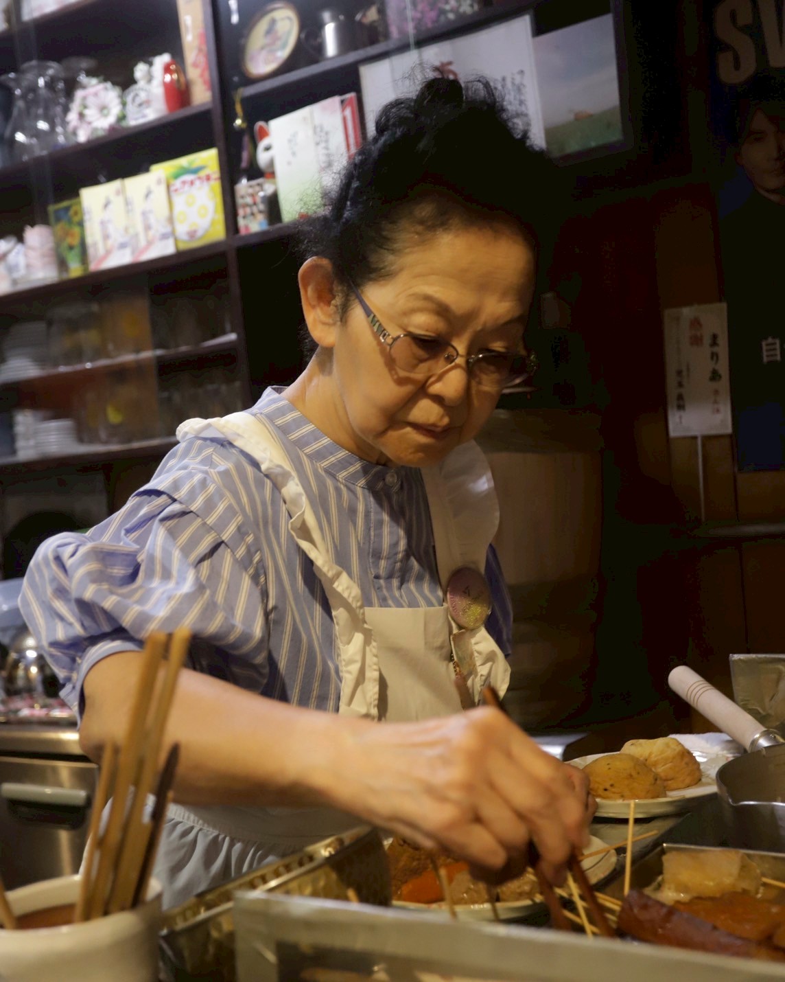 L字カウンターだけの店内に女将の存在感が抜群。フリルのついたエプロンがステキです。