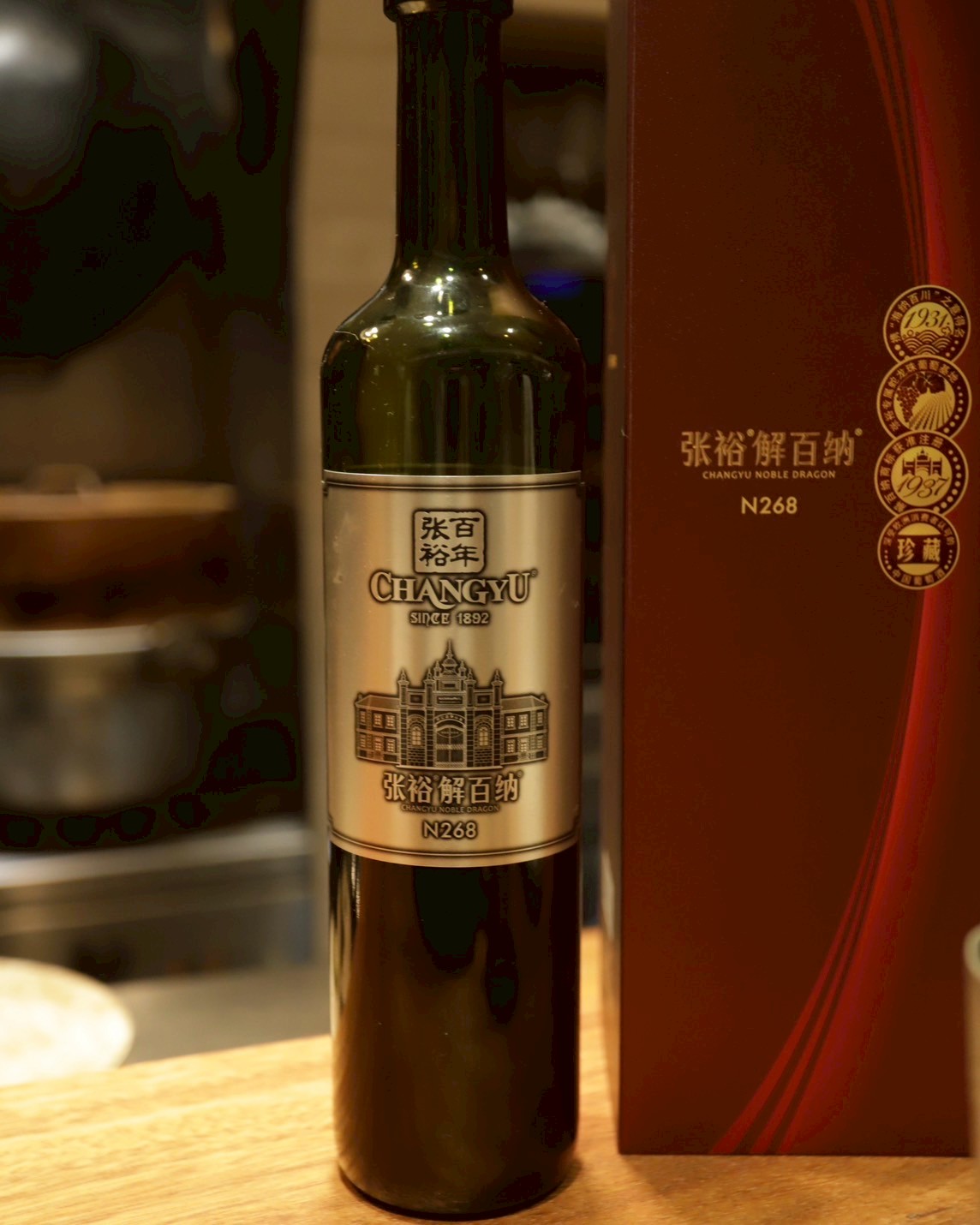 合わせるのは中国のワイン「チャンユー」の赤。いかつい化粧箱に入ってます!
