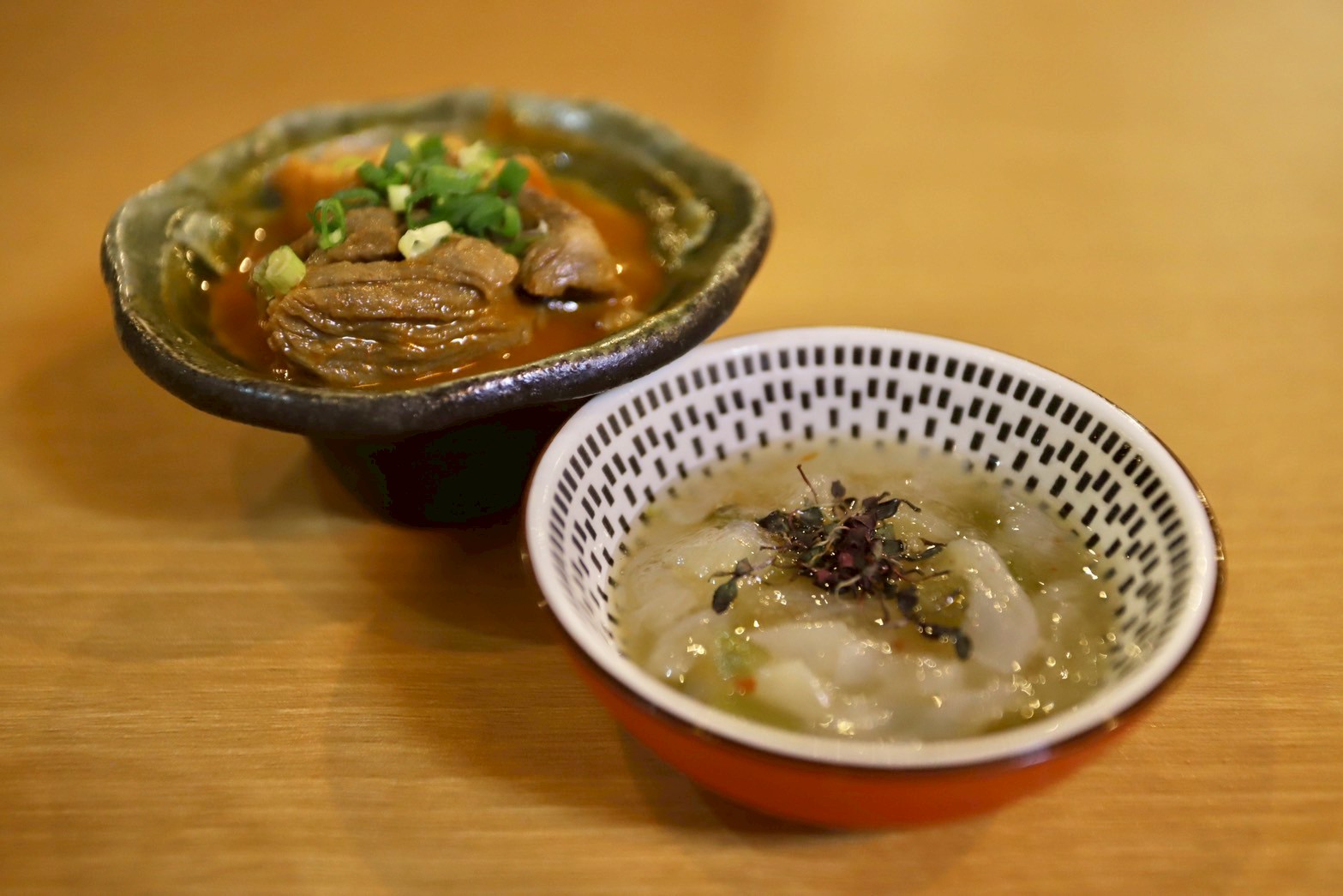 こちらのお通しは「貝ヒモワサビ」と「牛すじトマト煮込み」のように、数種類から選べるシステム。二人で別々のものを選び、シェアして楽しめるのが嬉しいポイントです。
