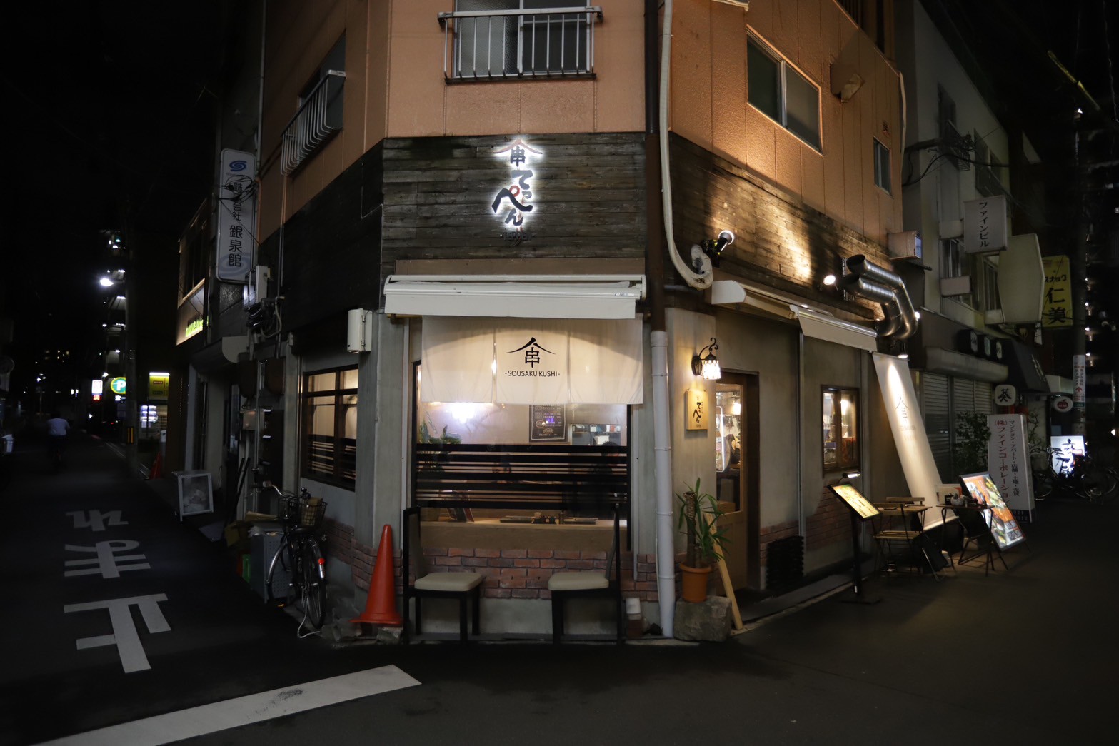京橋駅を降り、多くの人が待ち合わせに利用するあの「真実の口」のオブジェ(筆者が勝手に名付けています)を横目に、新京橋商店街をまっすぐ進んだところに店を構えるのが、「鉄板創作串 てっぺん 京橋店」さんです。