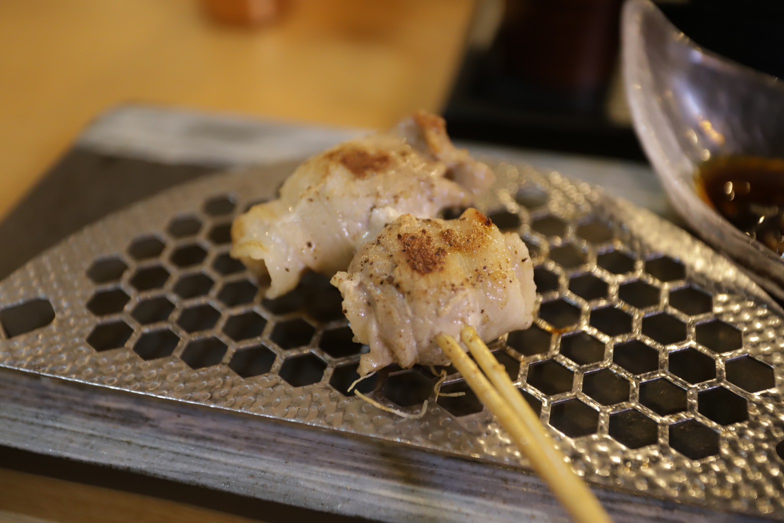 生ハムメロンから着想を得たという、豚肉でシャインマスカットを巻いた串。豚肉の脂身と塩気、そしてシャインマスカットの爽やかな甘酸っぱさが口の中で見事に調和します。新しい味覚の発見に感動を覚える一品です。