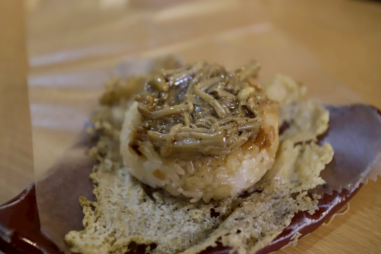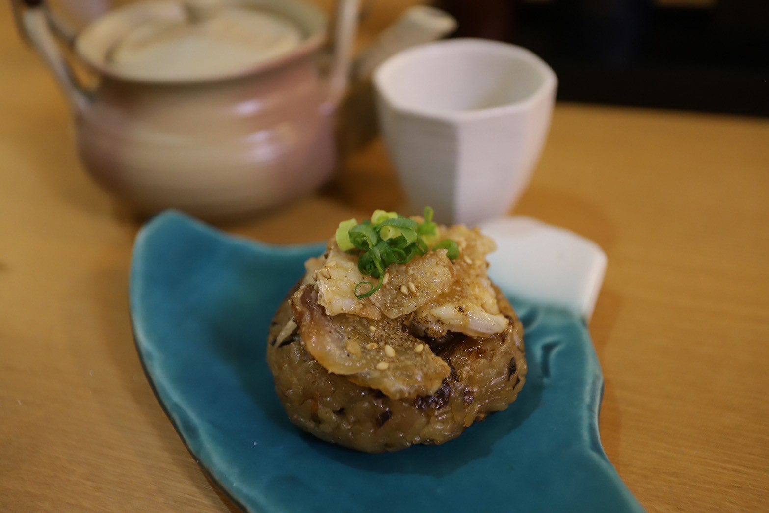 パリパリのチーズの羽が付いた焼きおにぎりは、見た目も食欲をそそります。トリュフの芳醇な香りと、なめたけの意外な組み合わせが斬新で、〆にぴったりな満足感のある一品です。