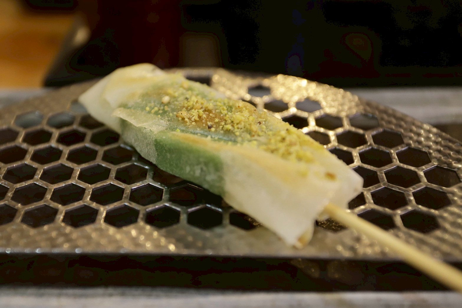 パリパリの春巻きの皮の中には、驚くほどモチモチした生麩が!ピスタチオ塩を添えており、その香ばしさが絶妙なアクセントになっています。食感のコントラストが楽しい一串です。