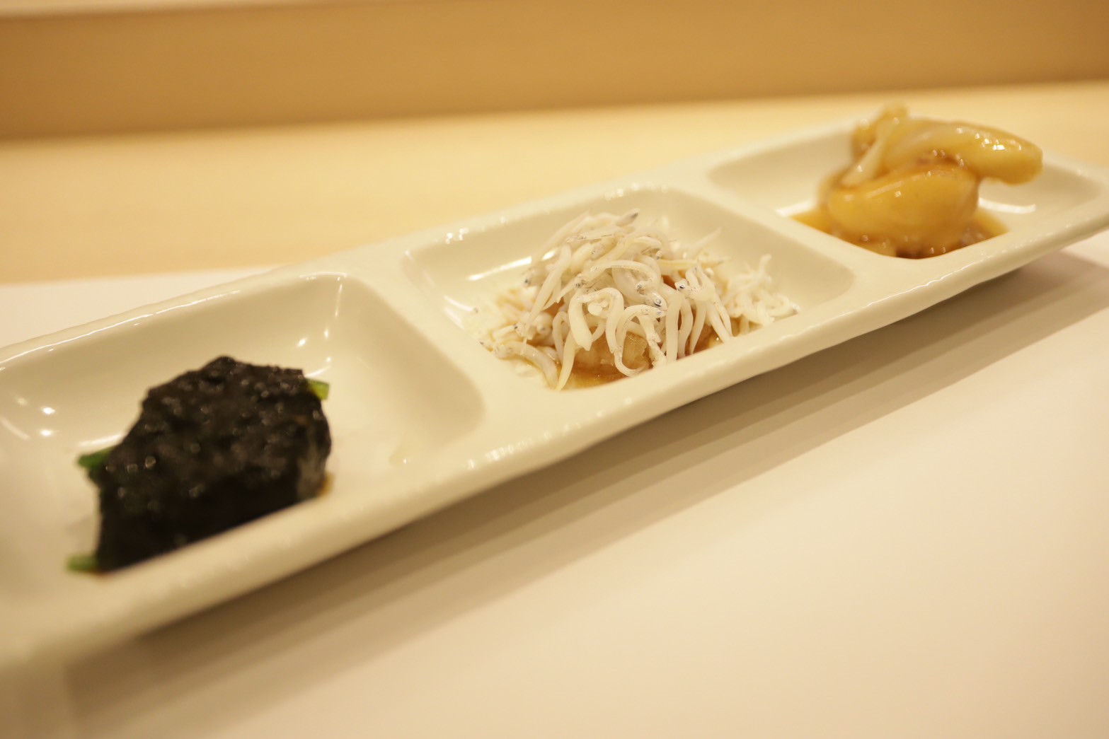 白身魚のあんかけ、シラスの佃煮、海苔のあんかけの3種盛り。