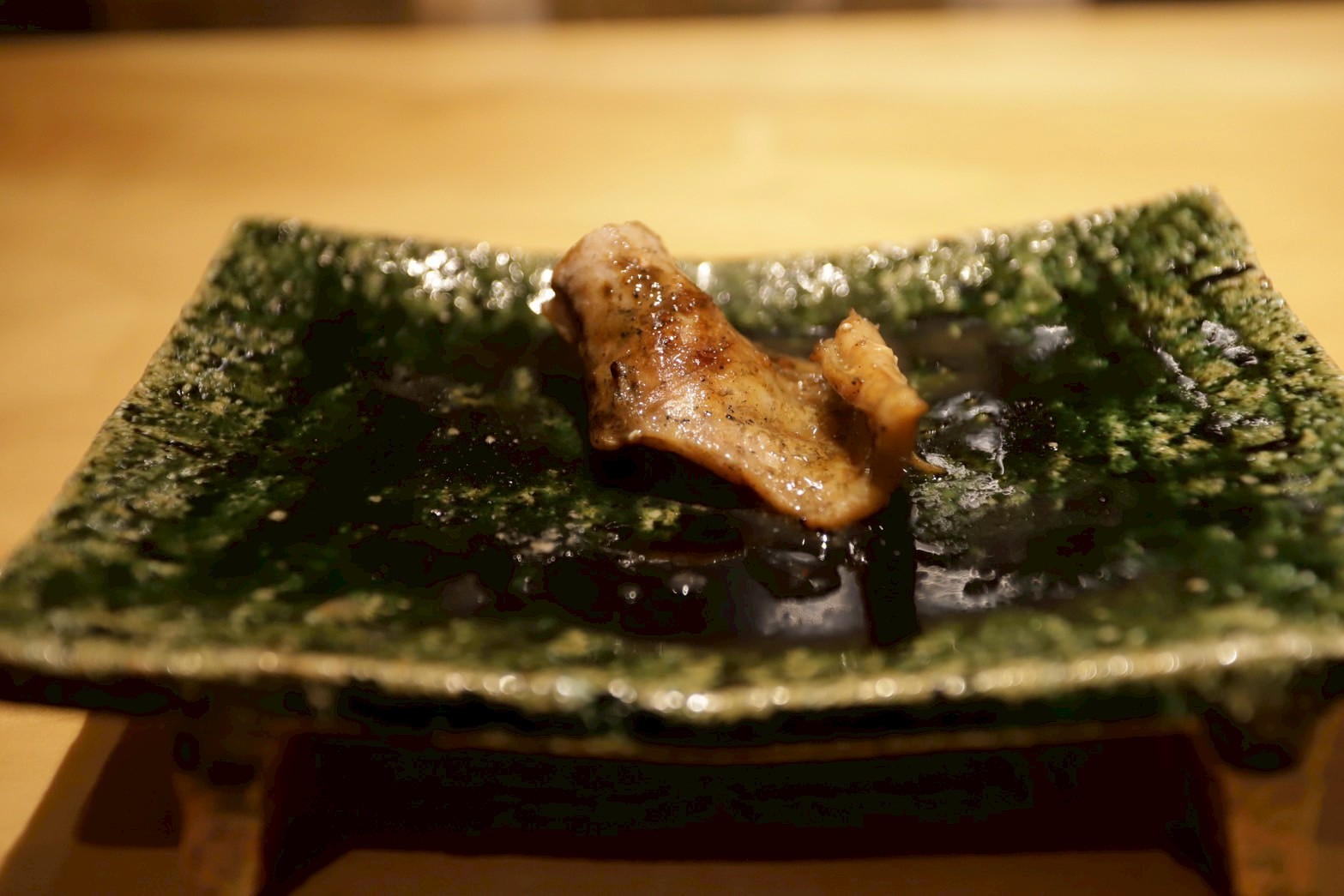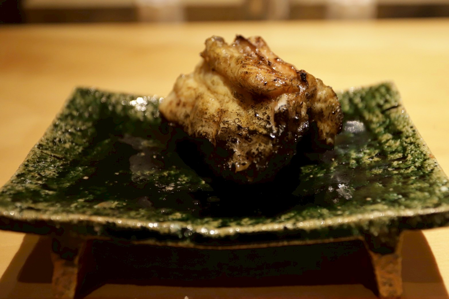 中落ちカルビタレ焼き: ホルモンのようにぷりぷりなのに、魚らしいアッサリとした脂。まさにフグの新しい世界を知りました。