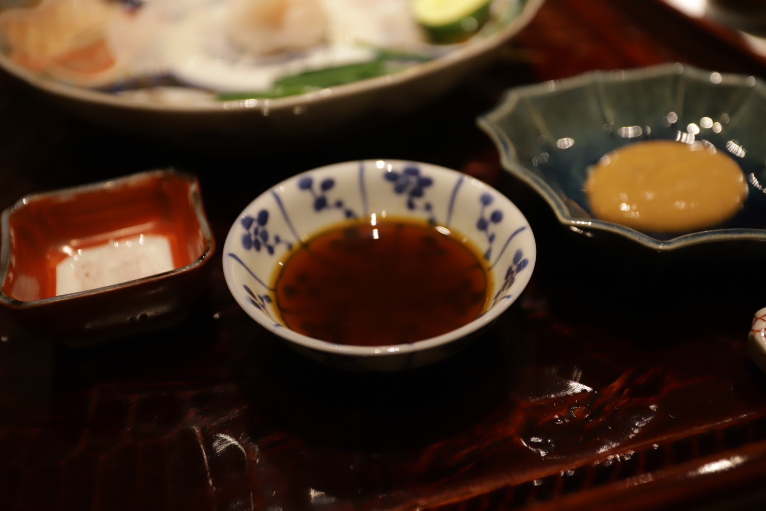 食べ方は、塩、合わせポン酢、あん肝ポン酢の3種類で食べ比べ。特に、塩だけで食べてもしっかり旨みを感じるのが、この極上ふぐの証です。さらに、あん肝ポン酢は美味しすぎて、単体で酒のアテとしてお代わりを頼んでしまいました。
