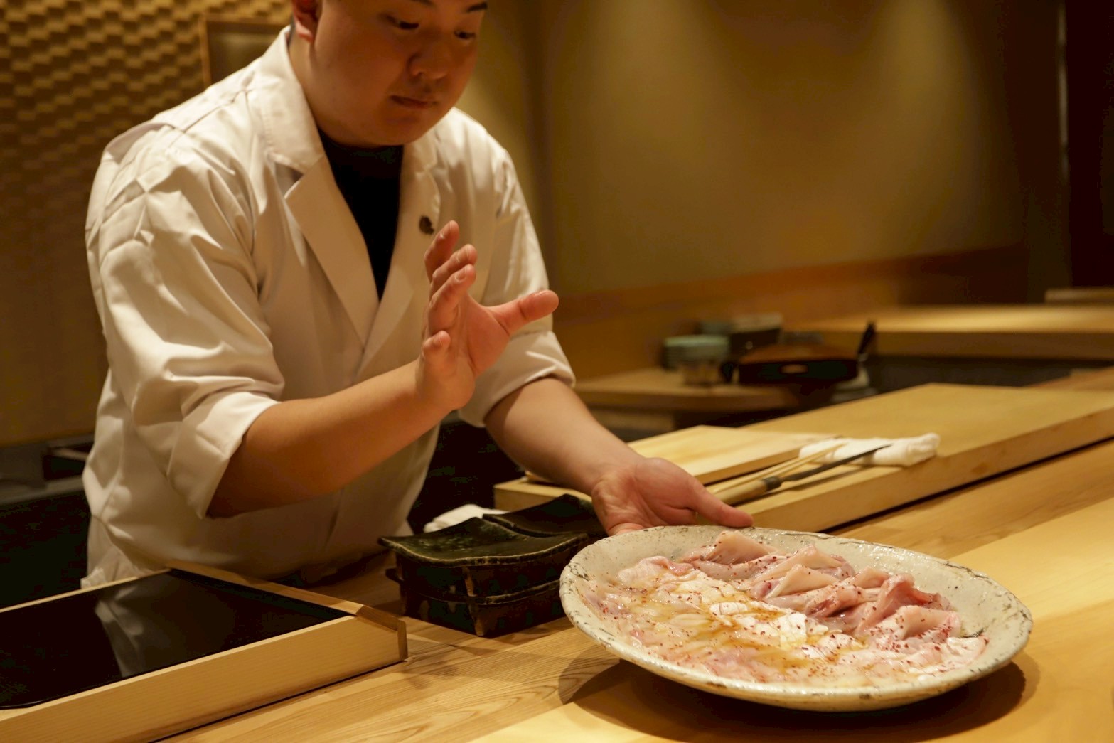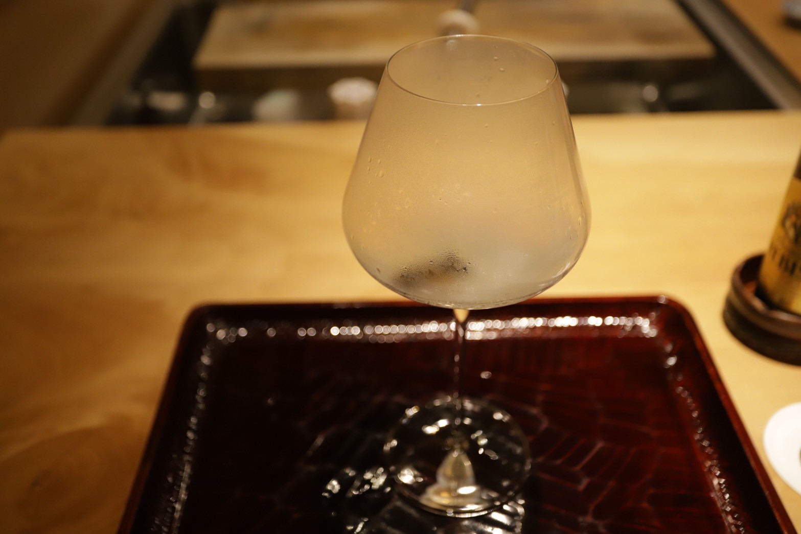 続いて、トラフグコンソメスープがワイングラスに注がれて提供されます。トラフグと昆布だしだけで引いたというスープは、香りが良すぎて思わず悶絶。胃袋が温まり、これから始まる美食への期待が膨らみます。