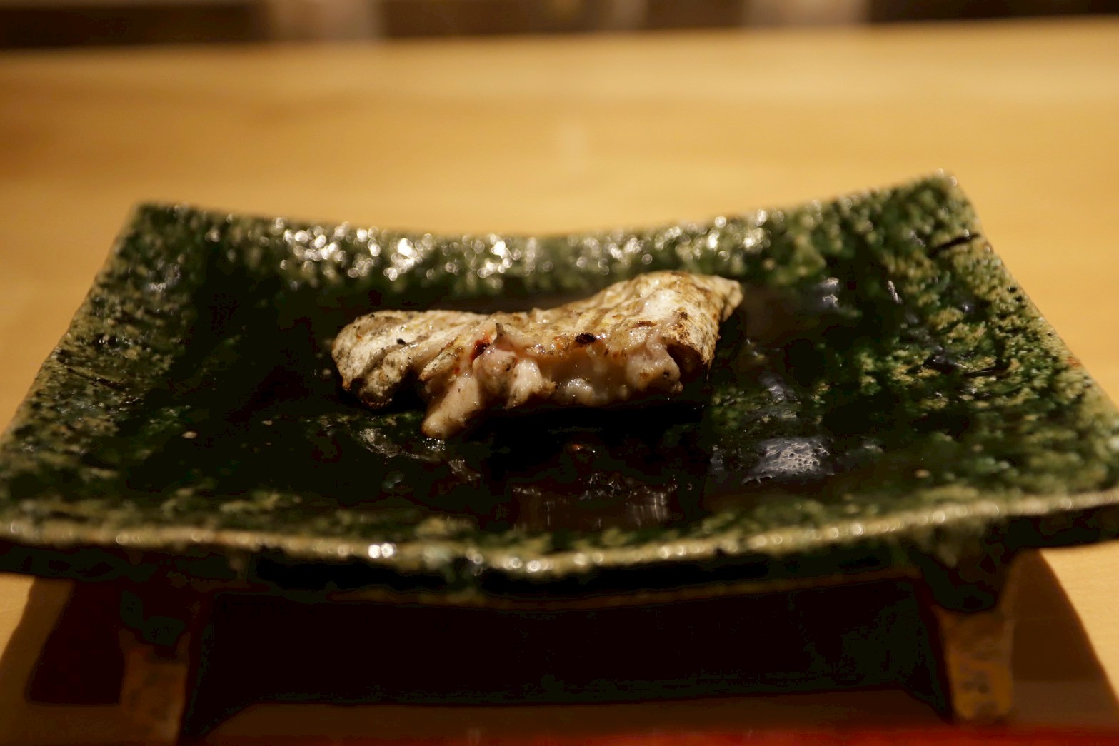 ここからが、この店の真骨頂とも言える焼きふぐタイムです。部位ごとに、火力マシマシで大迫力のパフォーマンスと共に目の前で焼き上げてくれます。脂の乗った「バケモノふぐ」だからこそ可能な贅沢です。