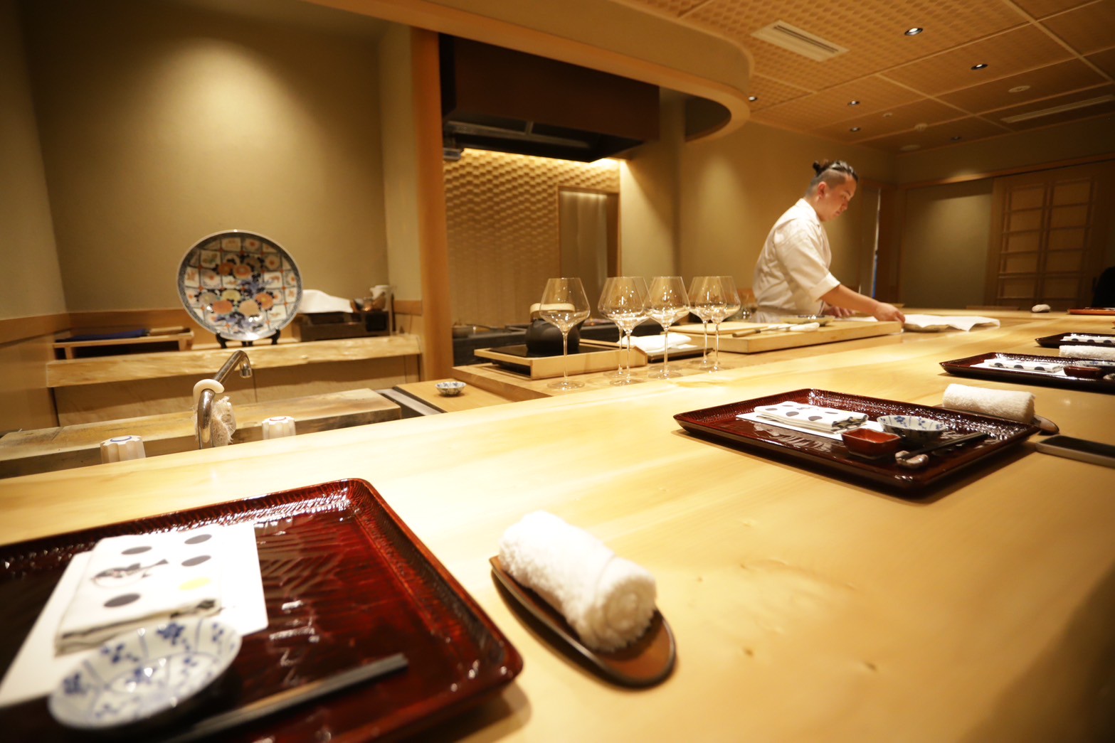 殺風景な扉に手書きのふぐのイラストという、一見すると通り過ぎてしまいそうな「初見殺し」の外観が特徴。しかし、その扉を開けると一変、高級感あふれる洗練されたカウンター席が広がります。この意図的なギャップは、特別な空間への期待感を高めてくれます。
