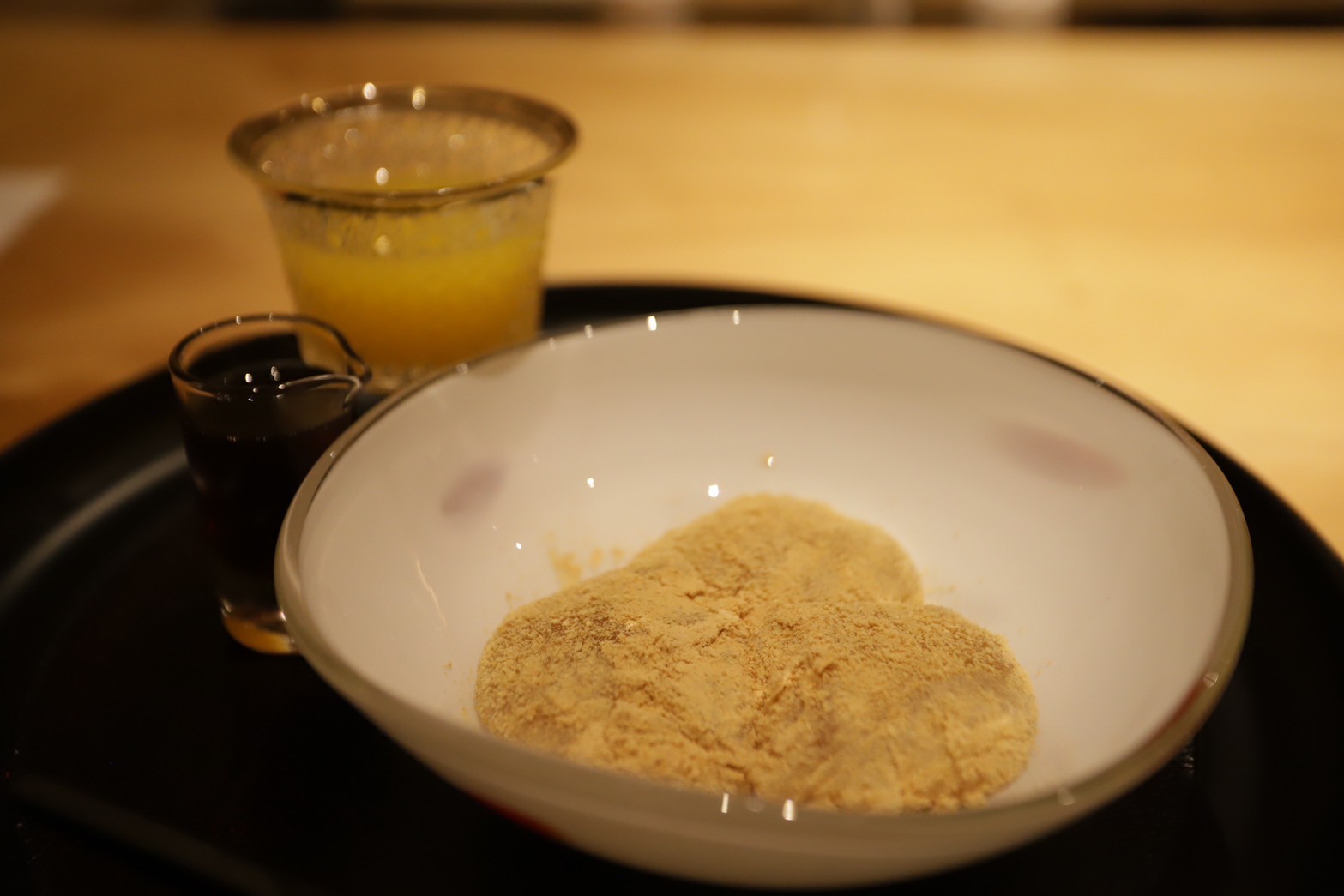 デザート: 目の前で練りたてのわらび餅。和三盆の上品な甘さに癒され、最後はオレンジジュースでスッキリ。