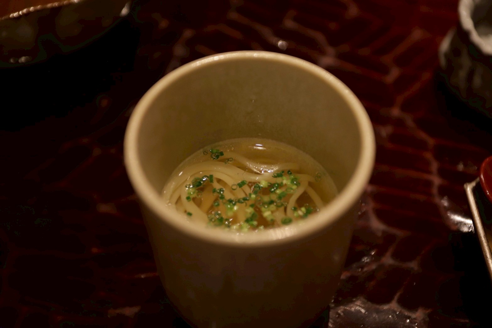 ふぐのアラと松茸: シンプルながら反則的な組み合わせ。細く切った白菜そうめんに、出汁が染みわたり、またしても感動。