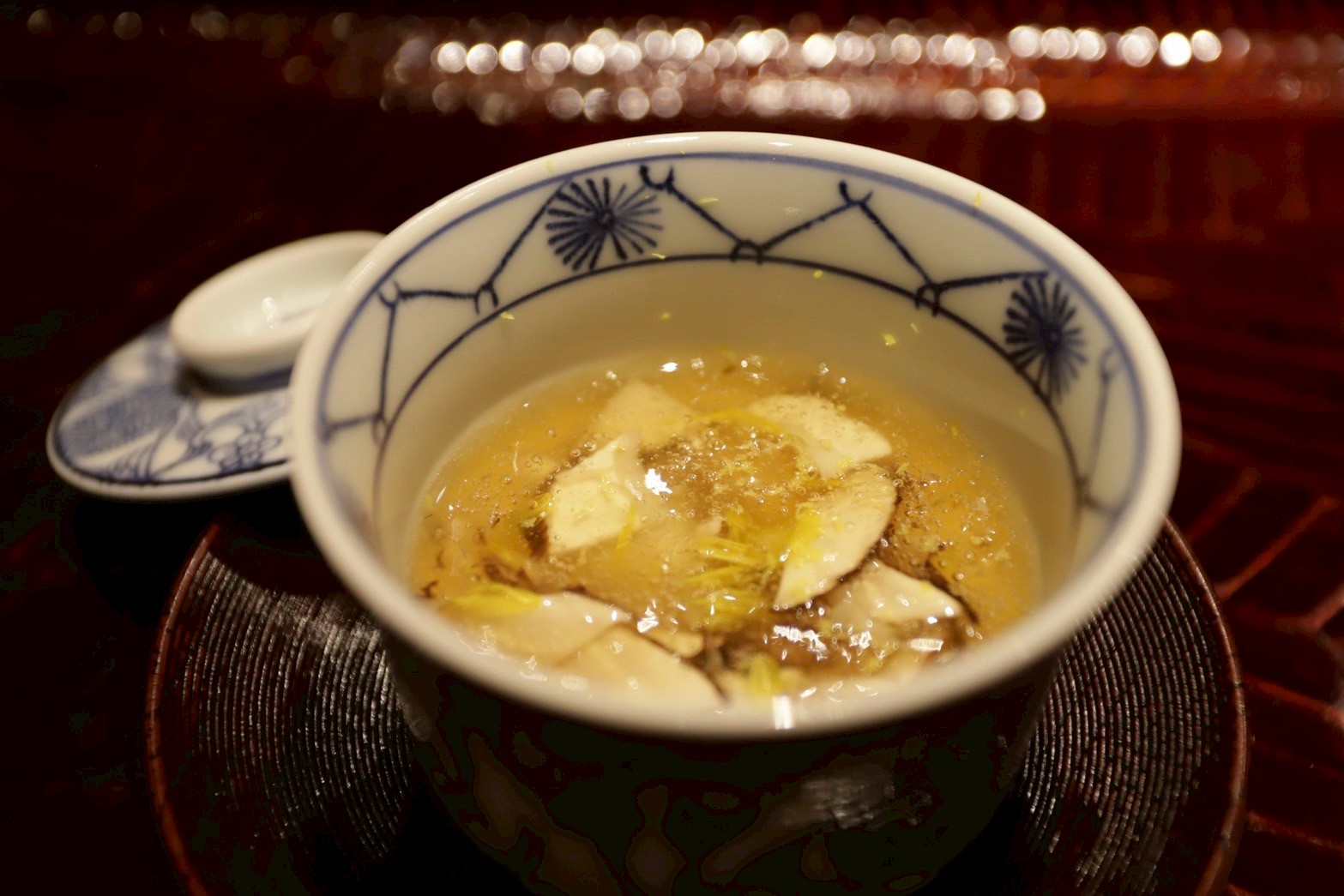 茶碗蒸し: トラフグの出汁だけで取った餡かけに、松茸の餡かけとトラフグの身が入った究極の一品。