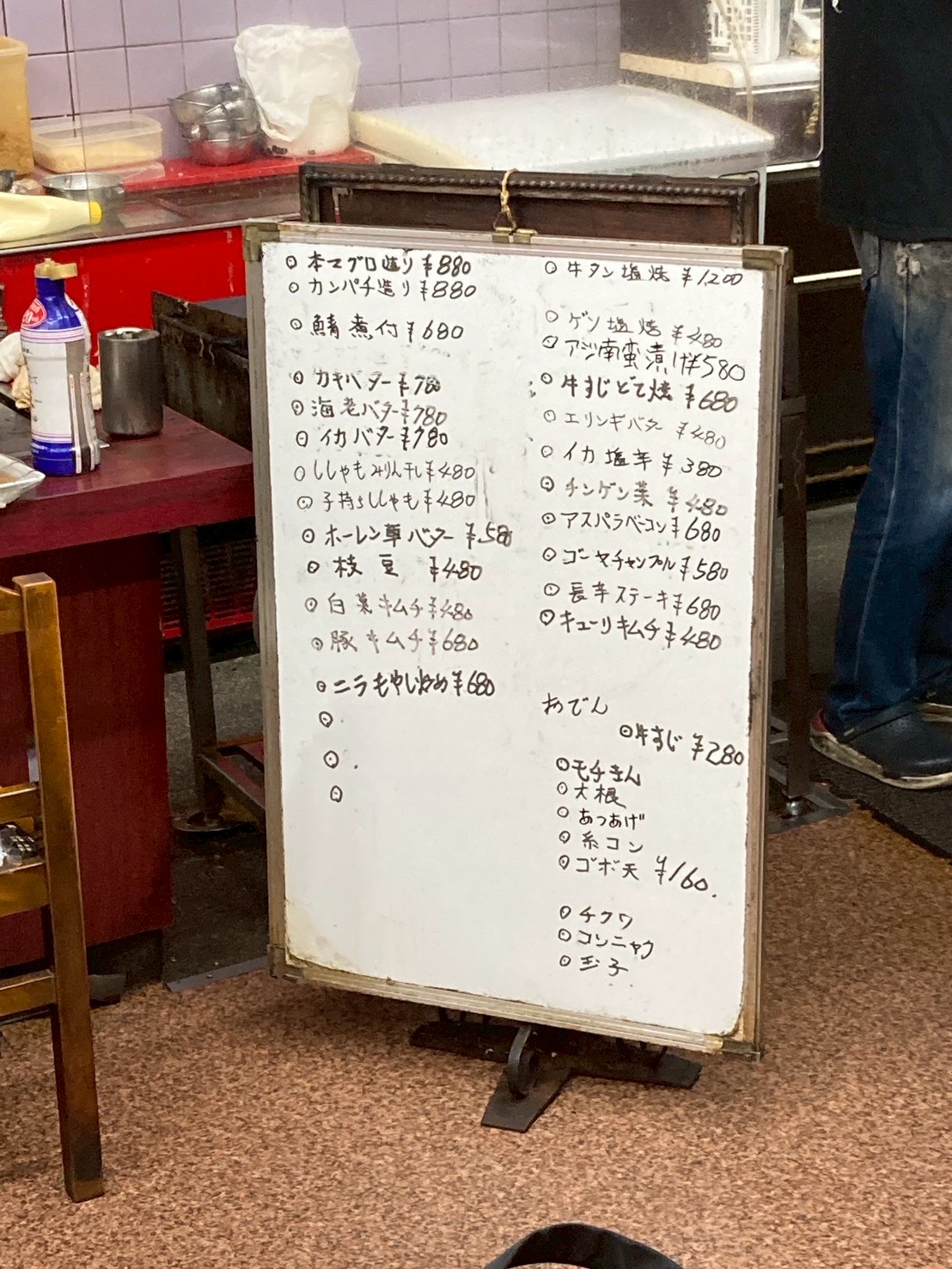 そしてホワイトボードにはお刺身やおばんざい、おでんなどがぎっしりと書き込まれています。