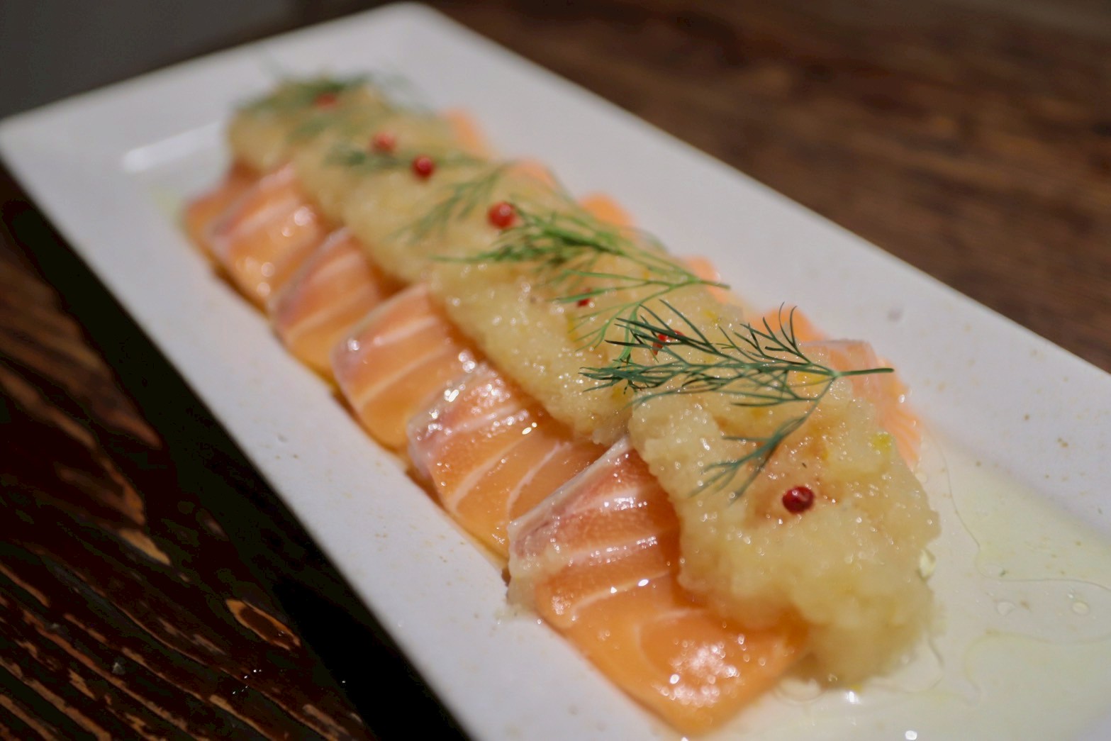 サーモン和風カルパッチョ柚子風味(700円): 白菜の漬物を合わせるなど、和風テイストで日本酒が進むバリエーションも豊富です。