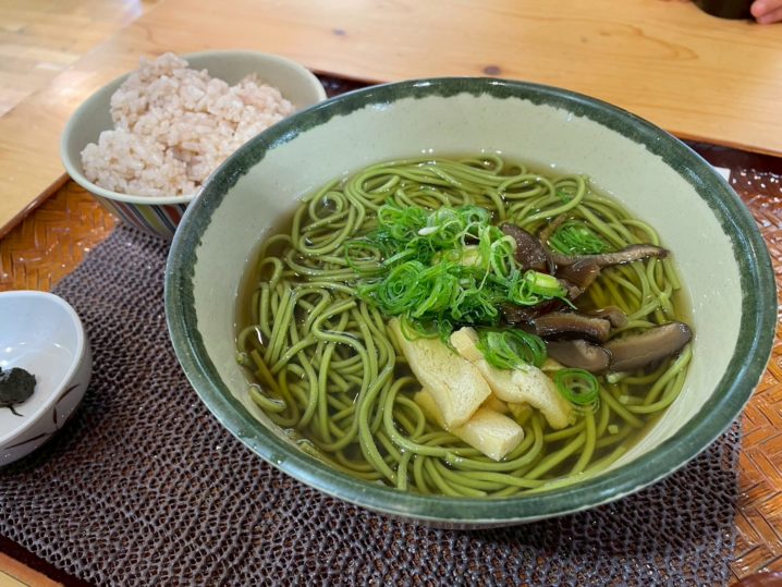 南山城村といえばやはりお茶が有名。ここでぜひ注文していただきたいのが、村の特産品を活かした名物「村抹茶そば」です。温かいそばと冷たいそばの両方が用意されており、今回は両方をいただきました(いずれも1,000円)。