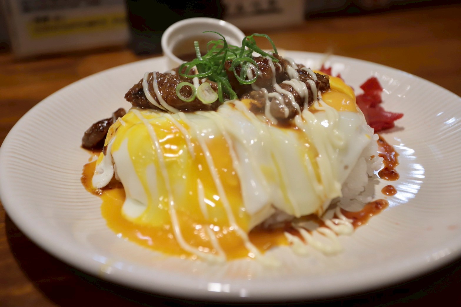 白ごはんの上にトロトロプルプルの目玉焼き、そして焼肉(肉の種類が選べます)を乗せた、ザ・男飯!!