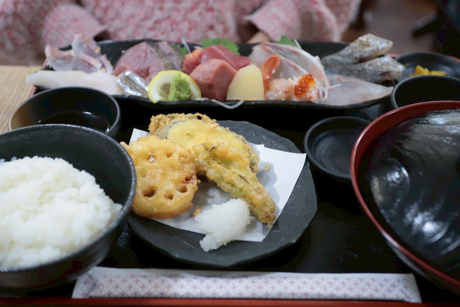 しかも小鉢(もずく酢)、刺身(ヒラマサ・スズキ・ヨコワ)、お味噌汁までついてます。