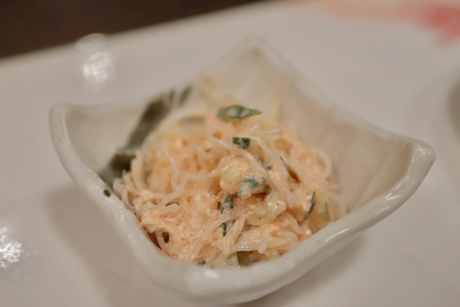 まずはカンパイしてお通しの春雨明太子サラダをつまむ。