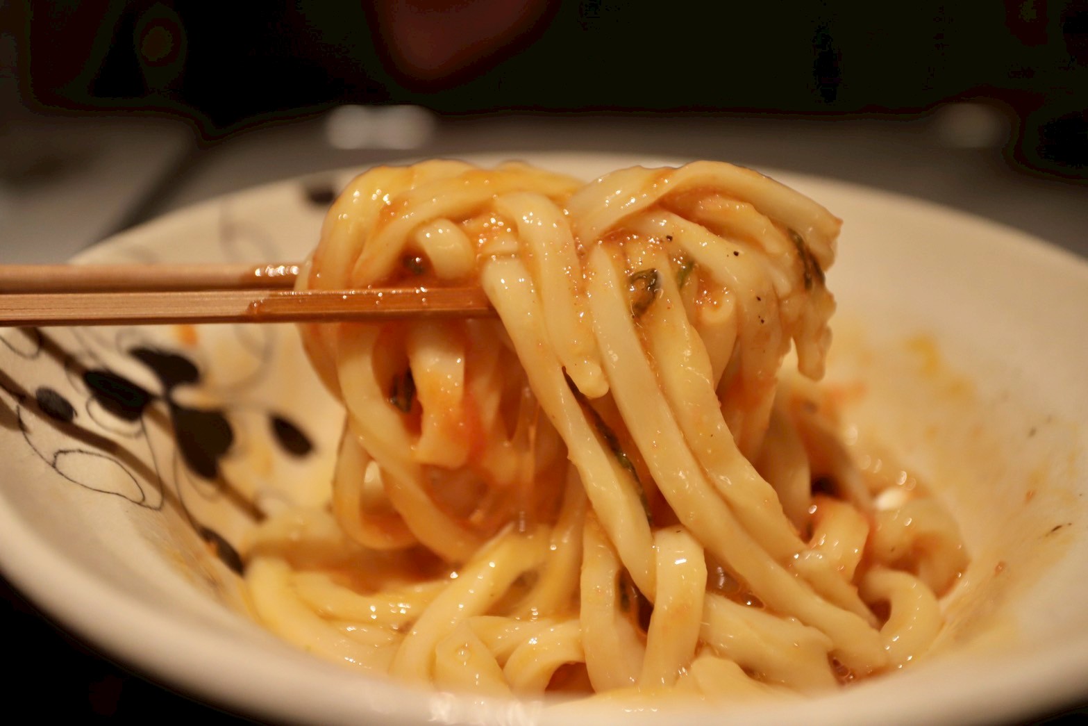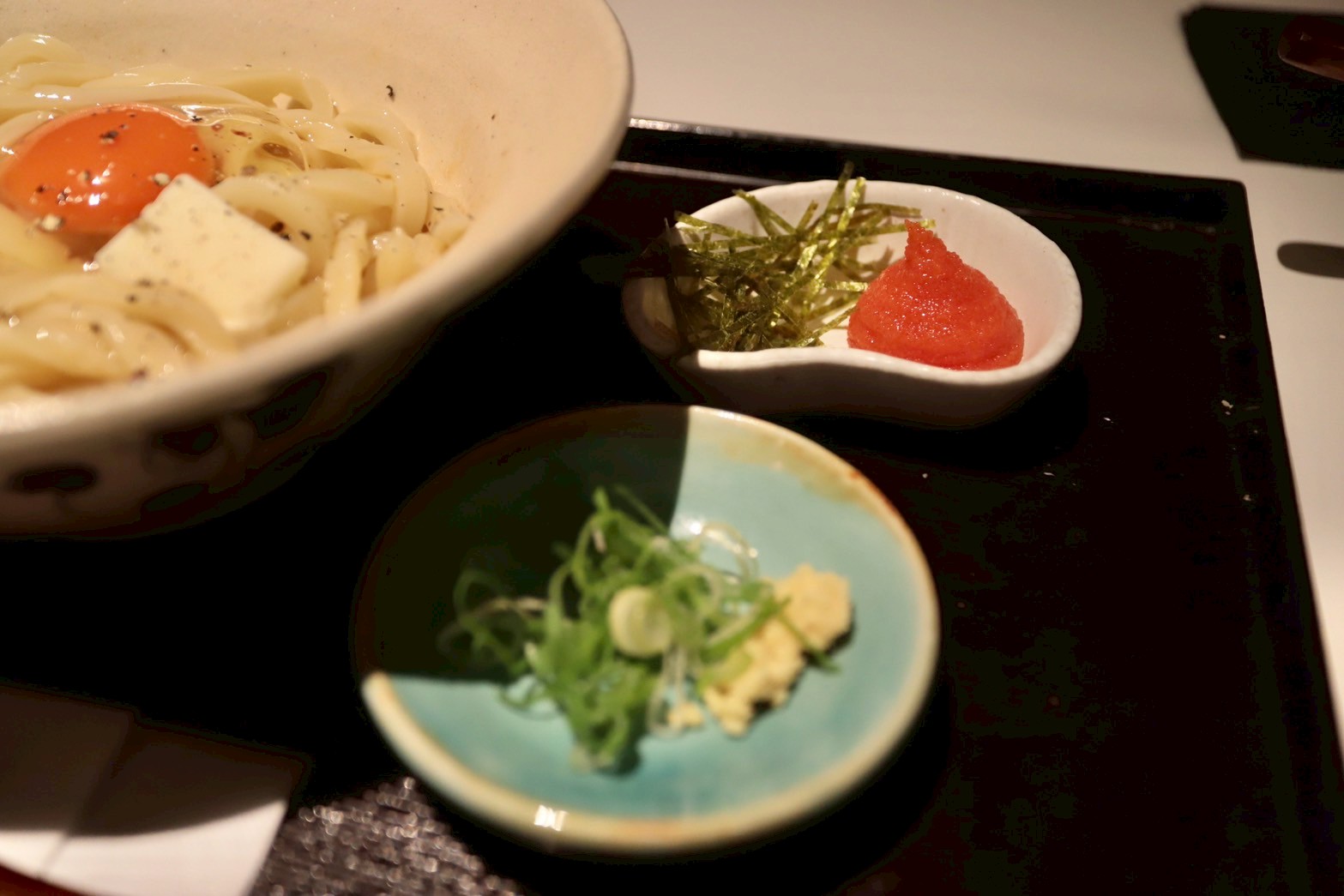 まずいただいたのは、見た目も華やかな釜玉めんたいこバター。