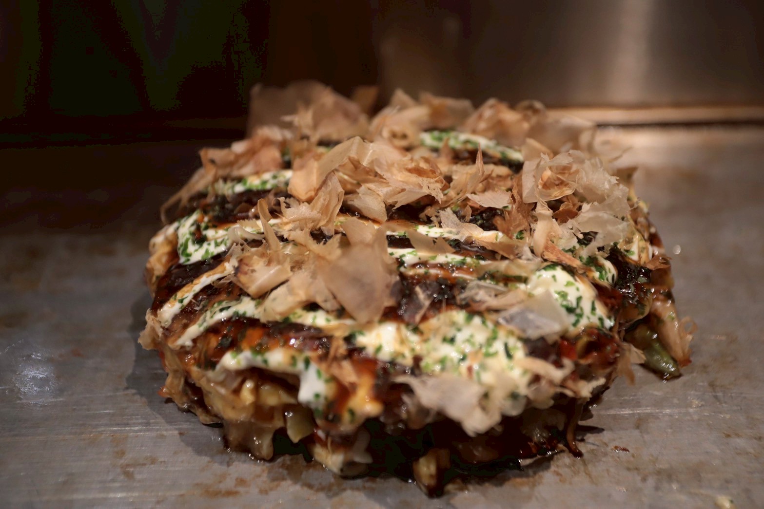 高さのあるお好み焼きを30分かけてじっくり焼き上げる。