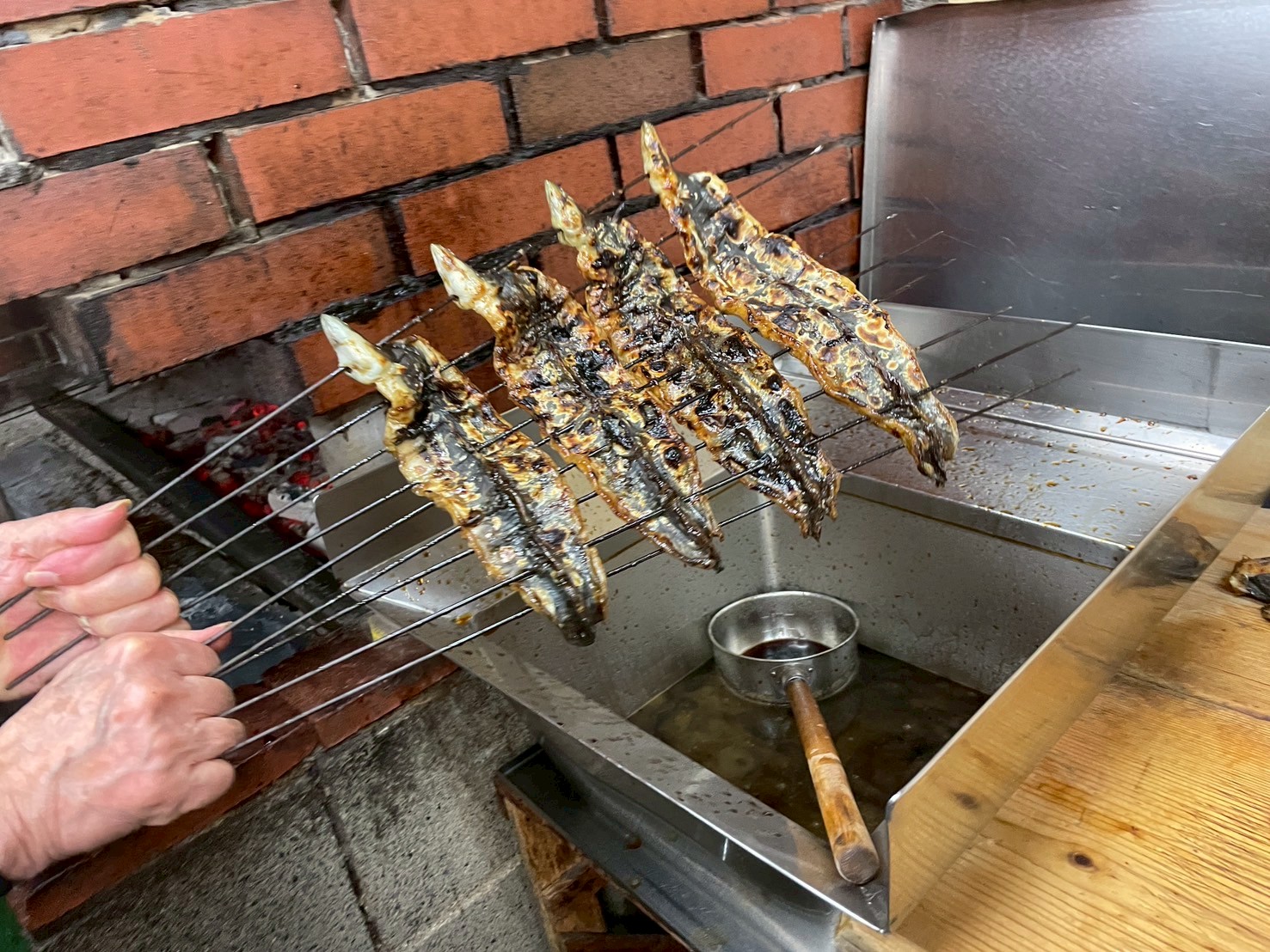 最後は「焼き」、炭火で少しずつ焼きながら特製のタレをかけていく。