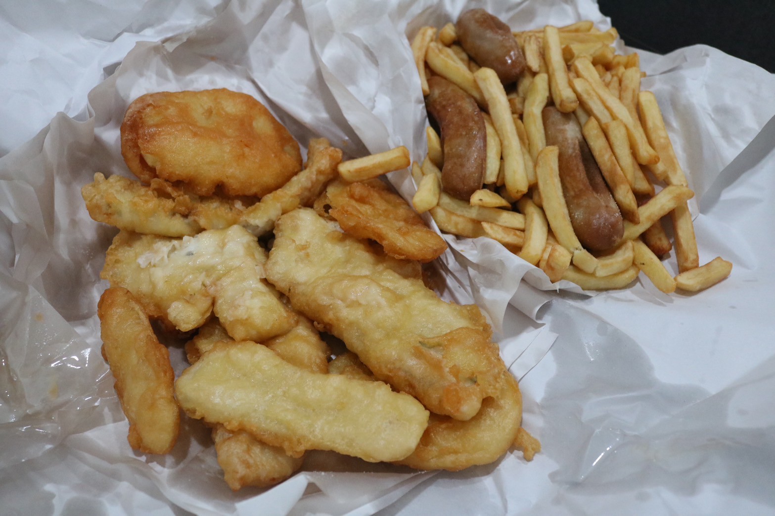 4フィッシュ、4ソーセージ、4ポテトフリッターそして山盛りのポテトフライ。