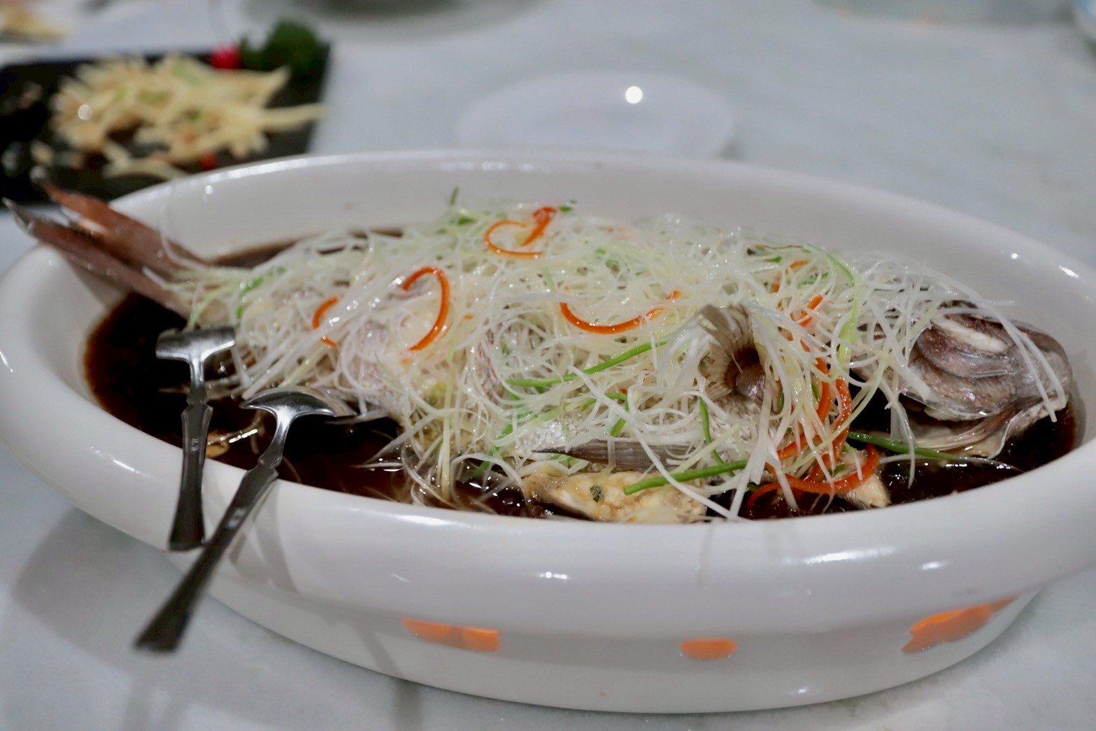 見事なサイズの鯛をたっぷりの香味野菜と共に蒸し上げてます。