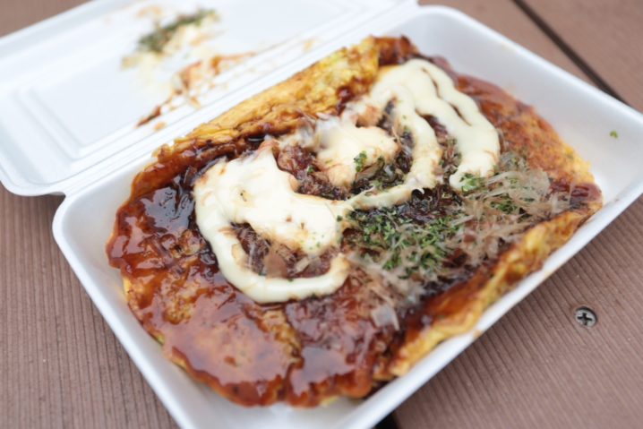 【名古屋グルメ】伏見「大潮屋」で名古屋名物「ワンハンドお好み焼き」を体験!テイクアウト専門、肉・イカ・玉子入りで330円。甘めのソースとモチモチ生地が絶妙な名古屋のソウルフードを解説。