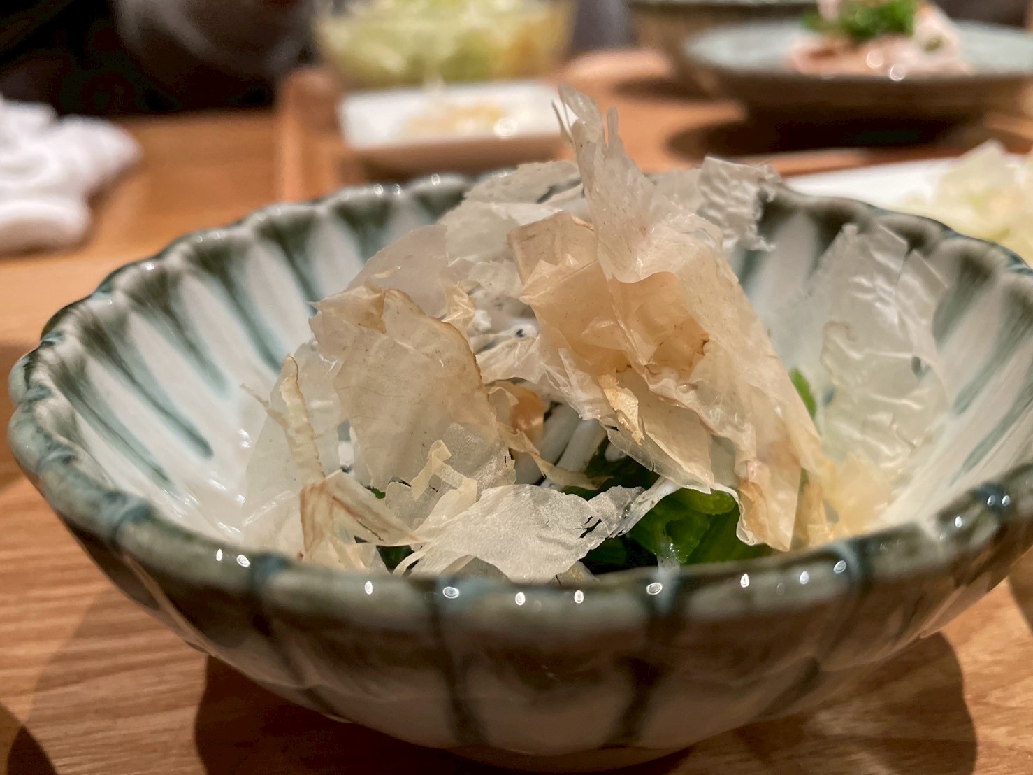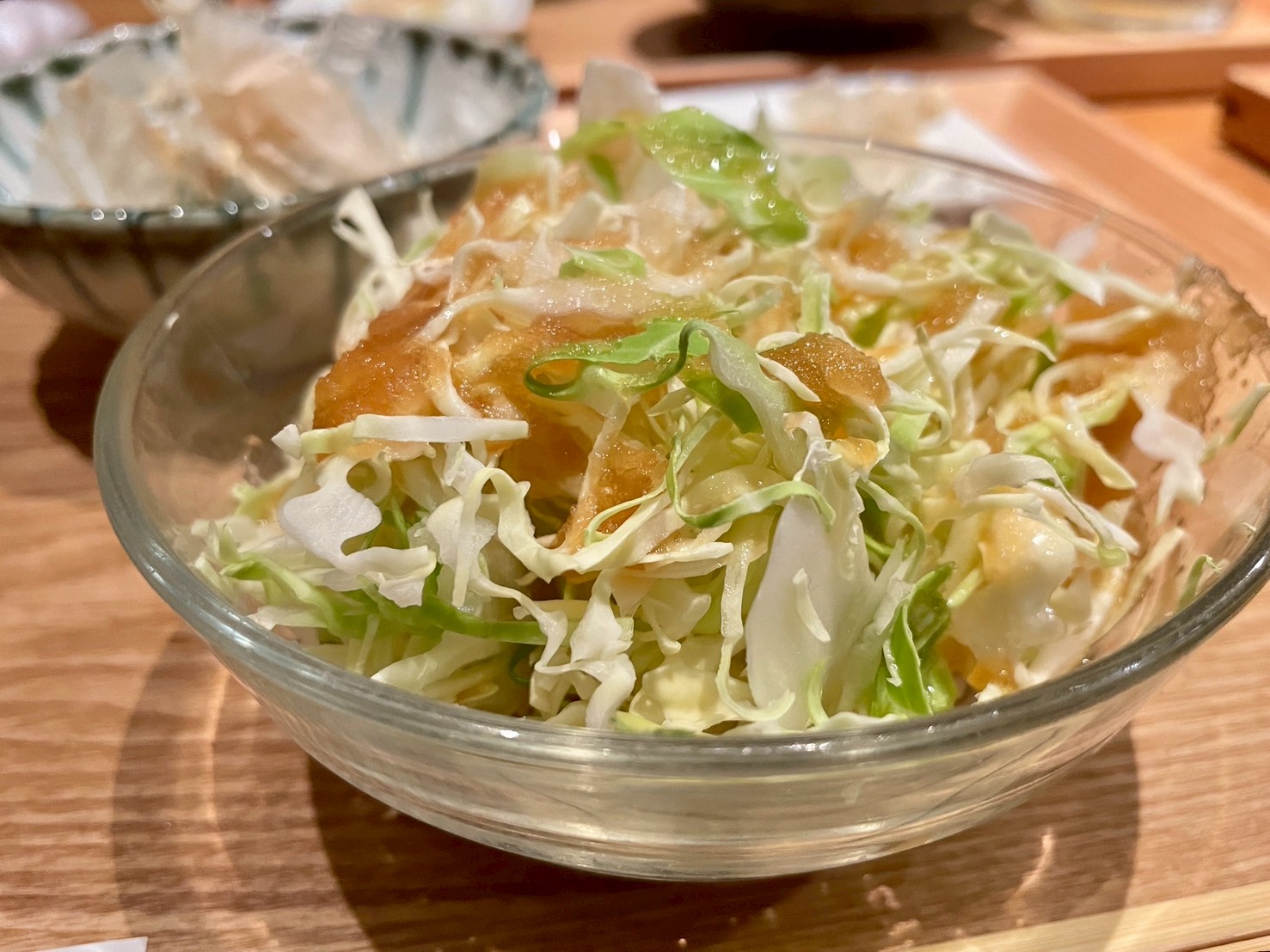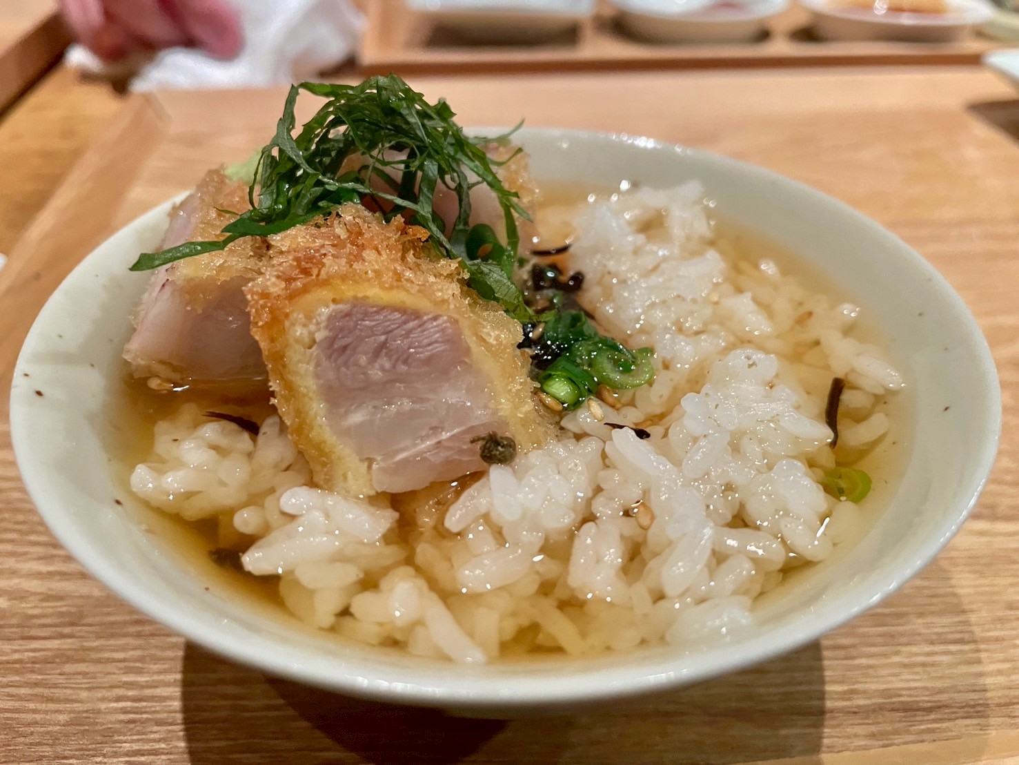 トンカツの脂に、お出汁とワサビと塩昆布。