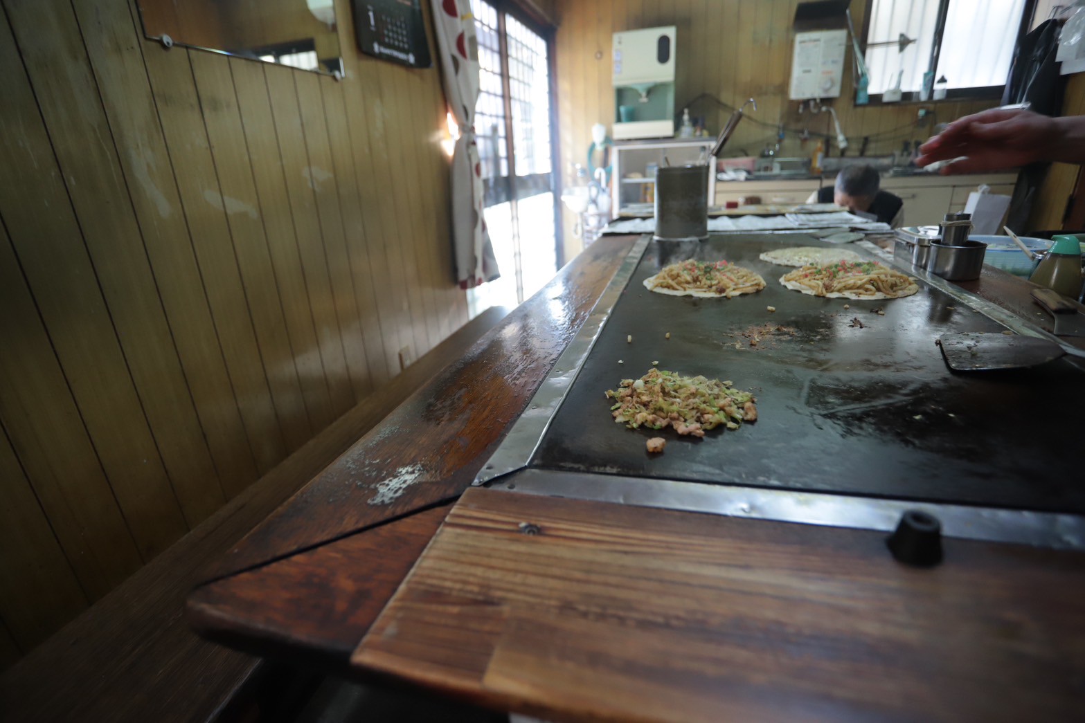 年季の入った店内は古き良き雰囲気をタイムマシンの様に残しています。鉄板を囲んで手際よく焼き上がっていくお料理を見ているだけでも楽しいのです。