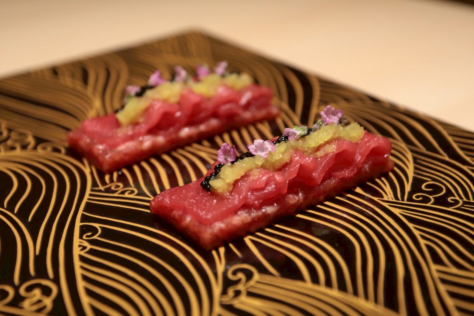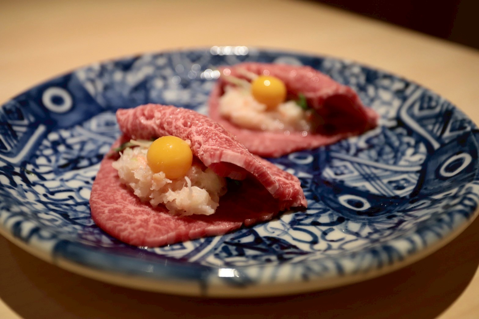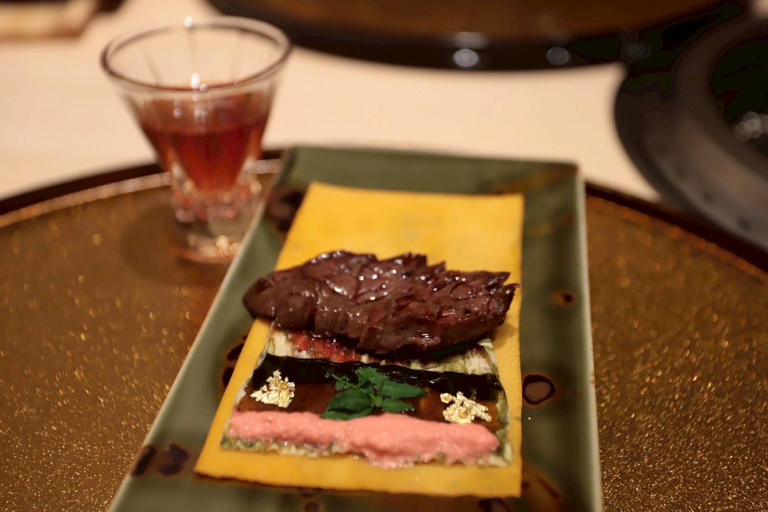 万葉牛の力強い旨みと本鮪のトロける食感。キャビアの塩気、たくあんの食感、そして忍ばせた昆布シートの相乗効果で、一品目からクライマックスのような満足感に包まれます。