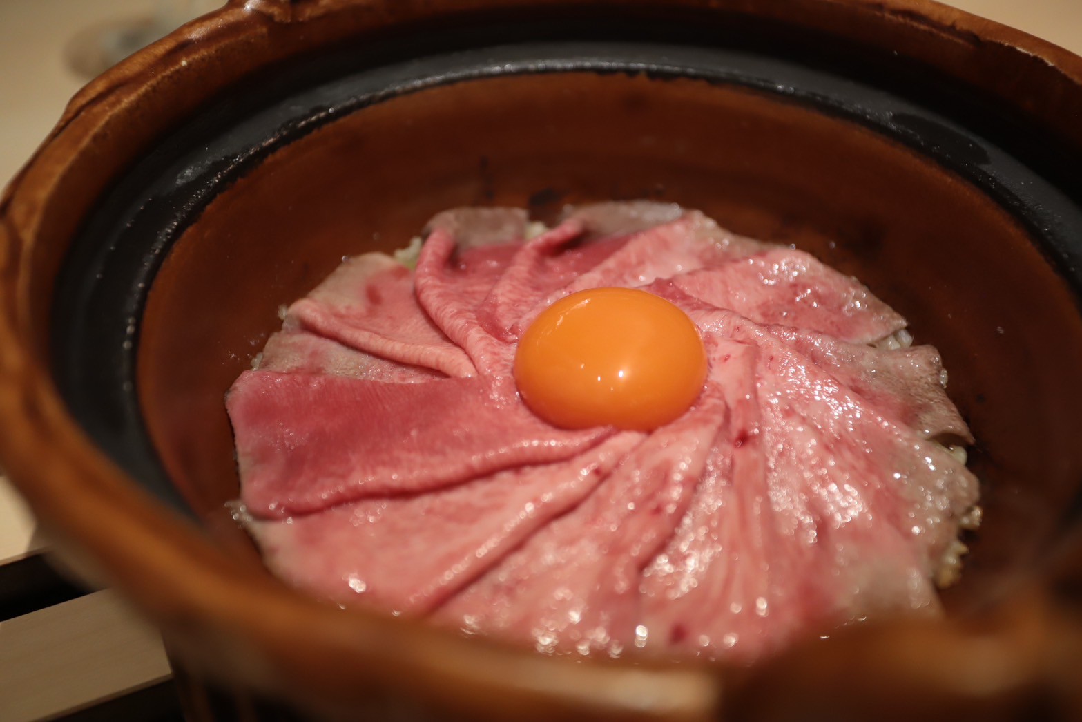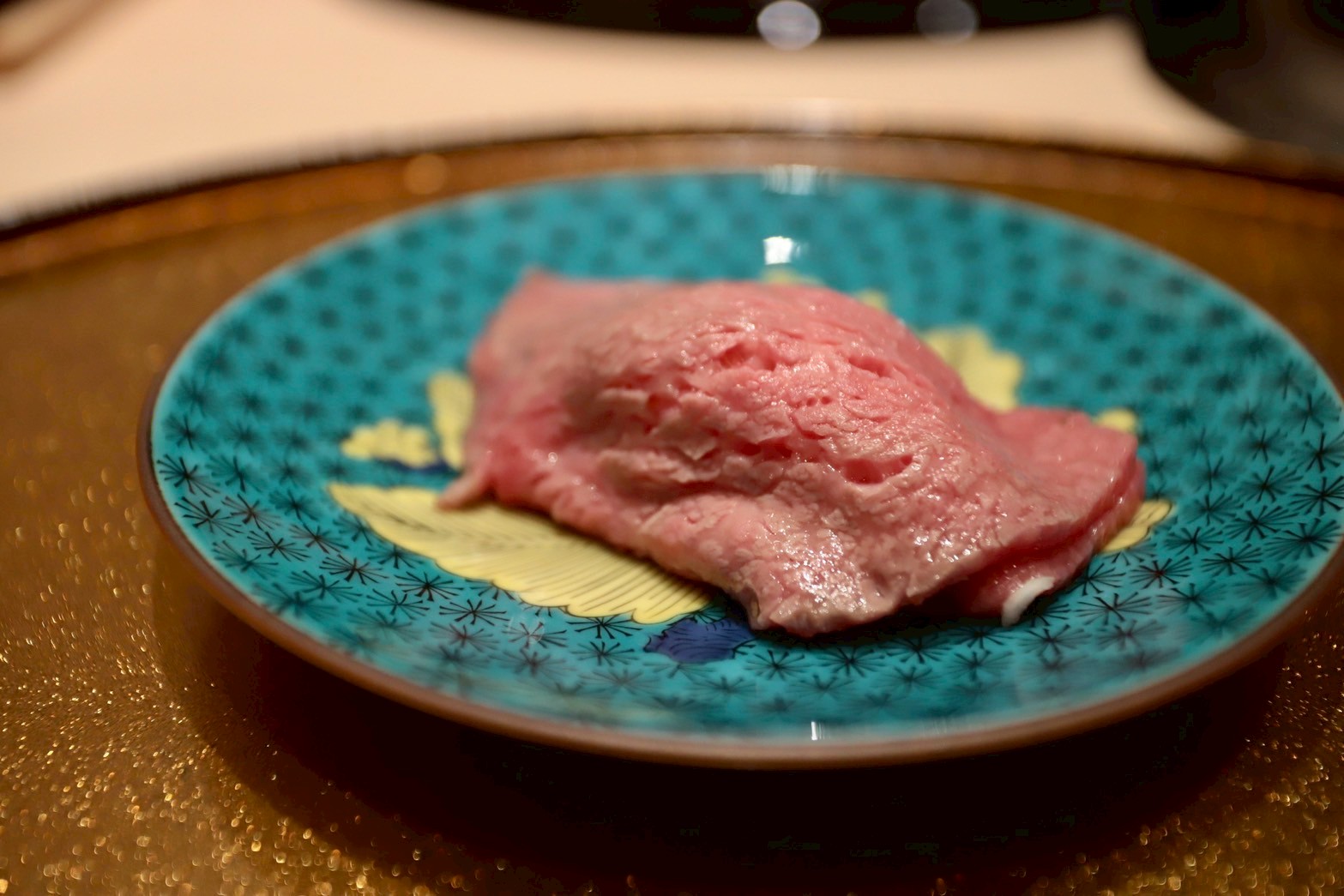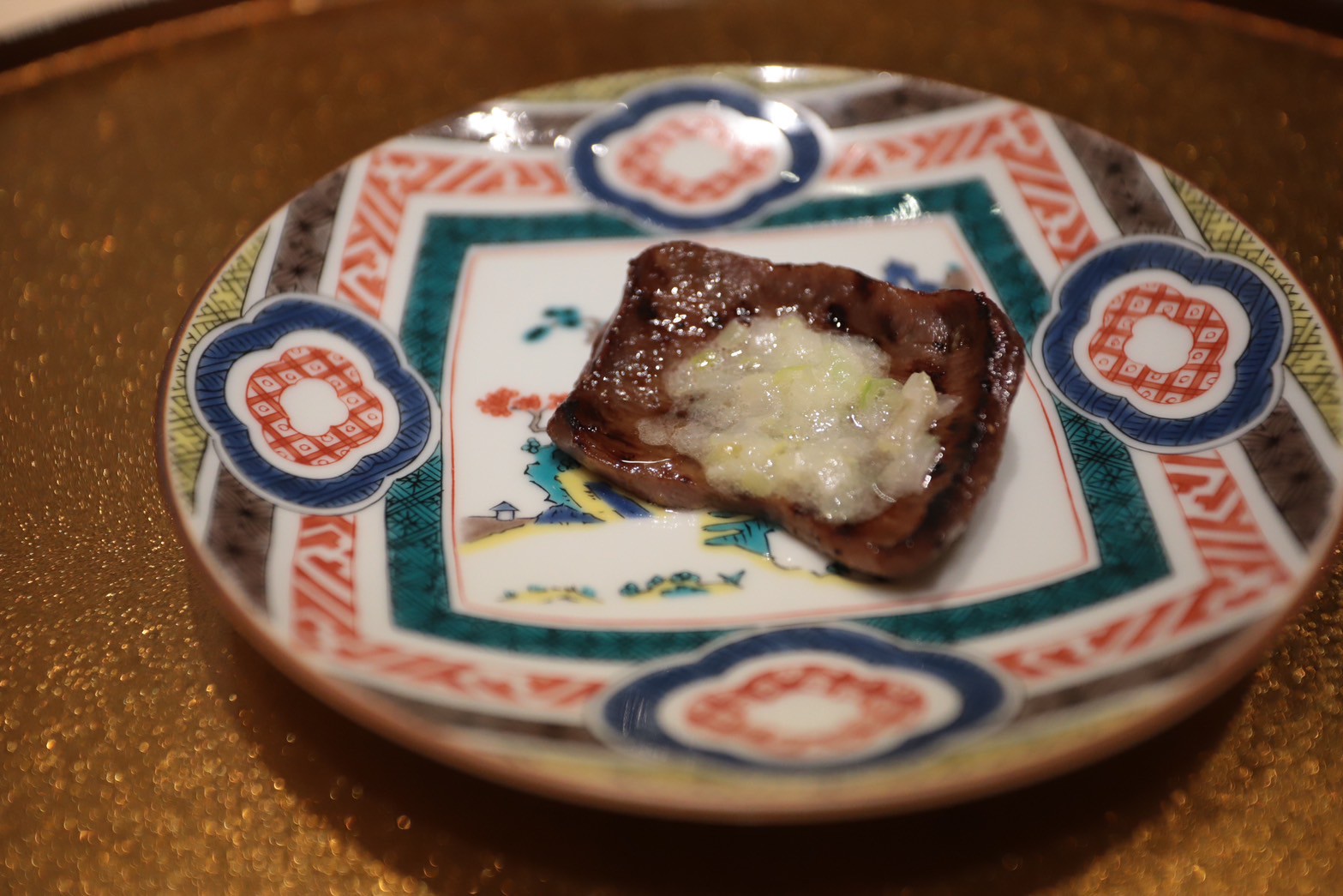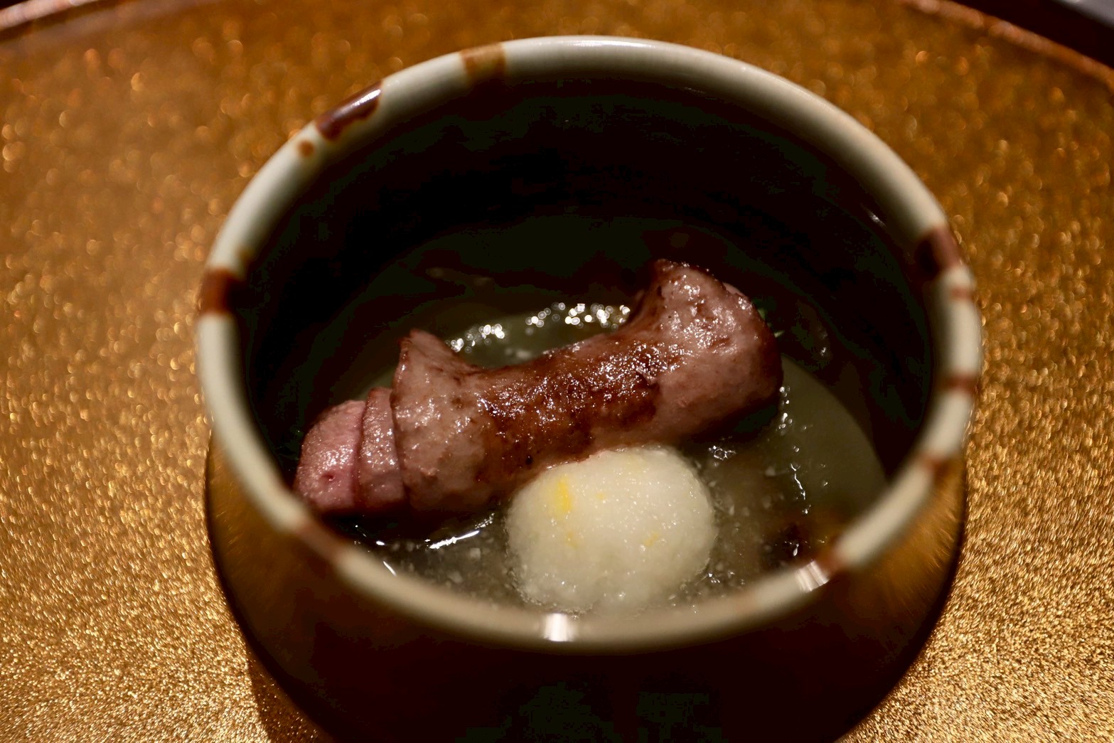 万葉牛の力強い旨みと本鮪のトロける食感。キャビアの塩気、たくあんの食感、そして忍ばせた昆布シートの相乗効果で、一品目からクライマックスのような満足感に包まれます。